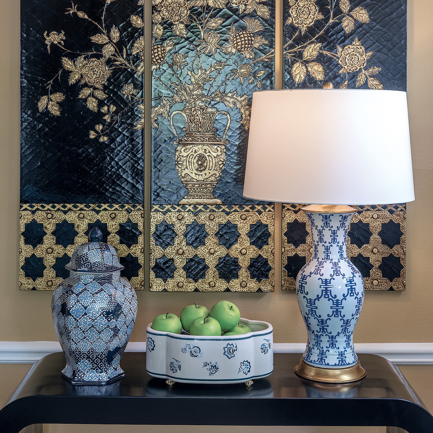 Madcap Cottage is taken by the exotic tempered with nods to the historic past with this layered blue and white pattern. Cool, calm and collected. A batik inspired pattern which lavishes magic on this collection of lighting and accessories.