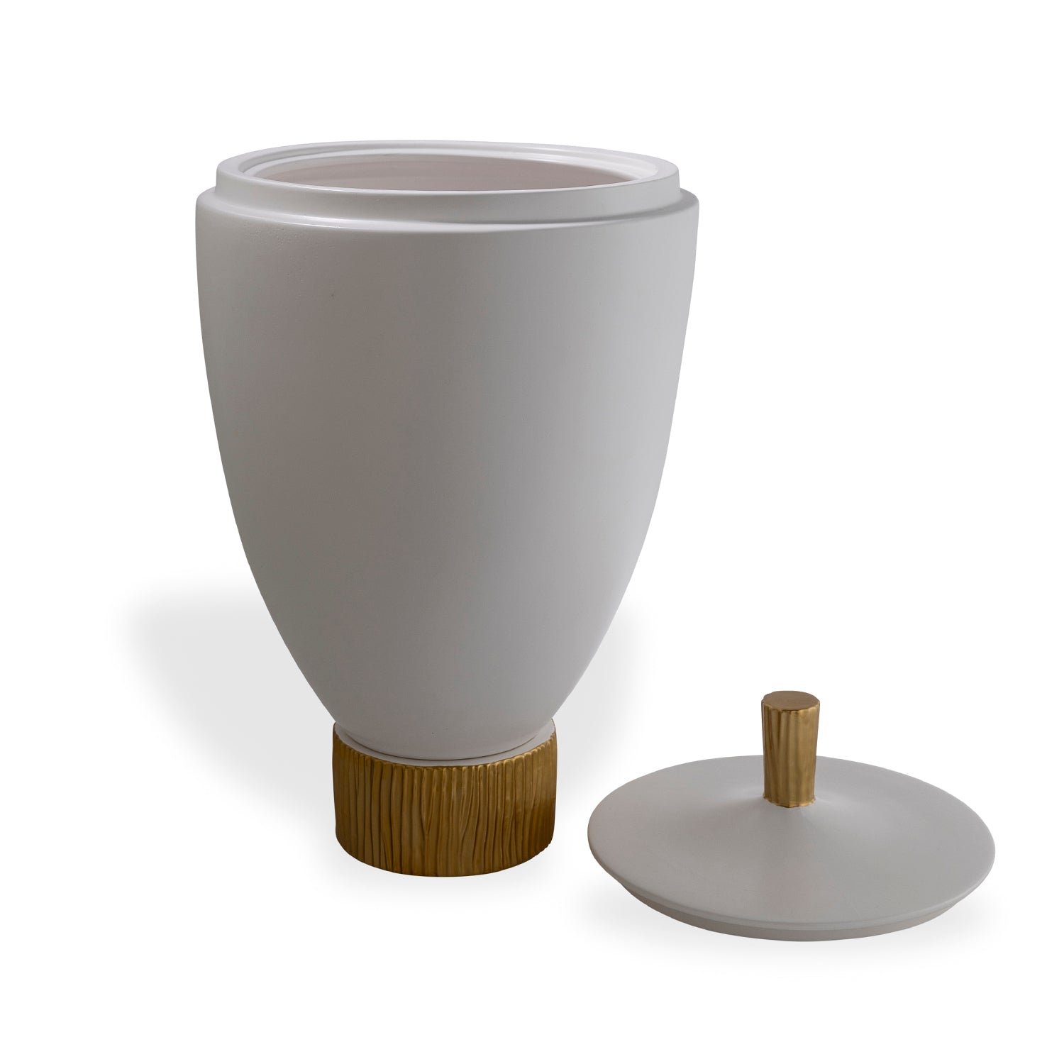 Modern, transitional and architectural all are words to describe our Bruner collection of accessories and containers. Cream white glaze is accented with touches of gold glaze on the ribbed base and finial on these deco inspired porcelain jars.