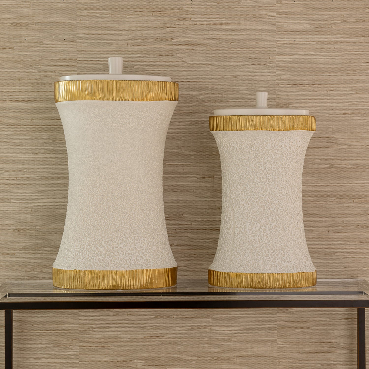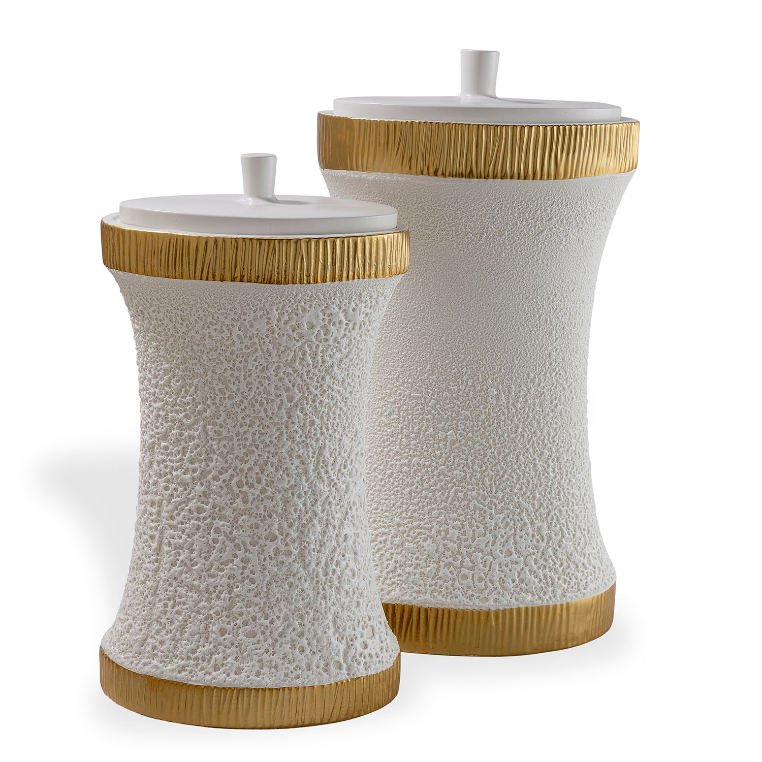 Modern and textural all are words to describe our Bruner collection of accessories and containers. Cream white glaze is accented with touches of gold glaze on the ribbed base and top on these deco inspired porcelain jars.