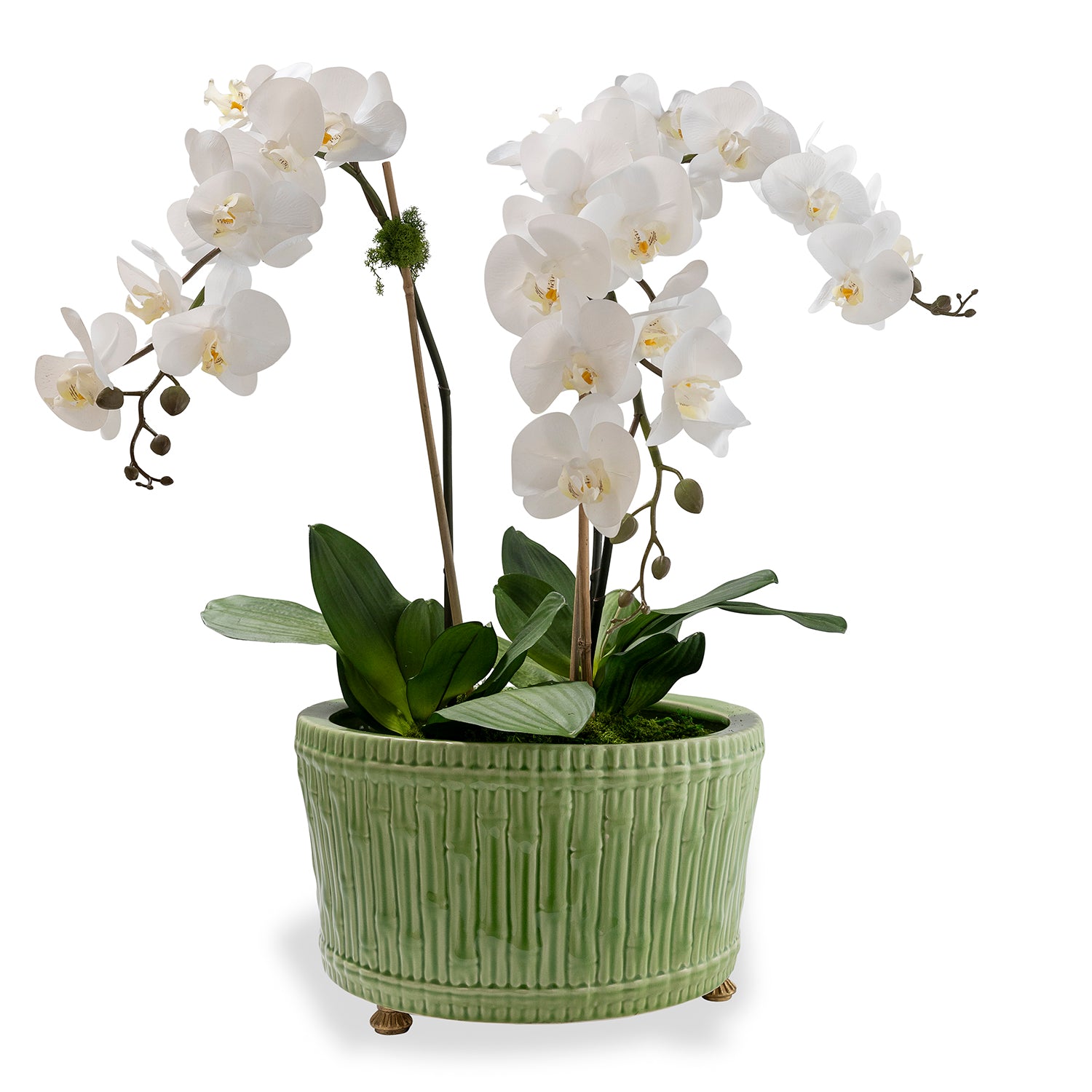 Accented with solid brass feet, the center basin features carved bamboo into the mold of the porcelain planter.