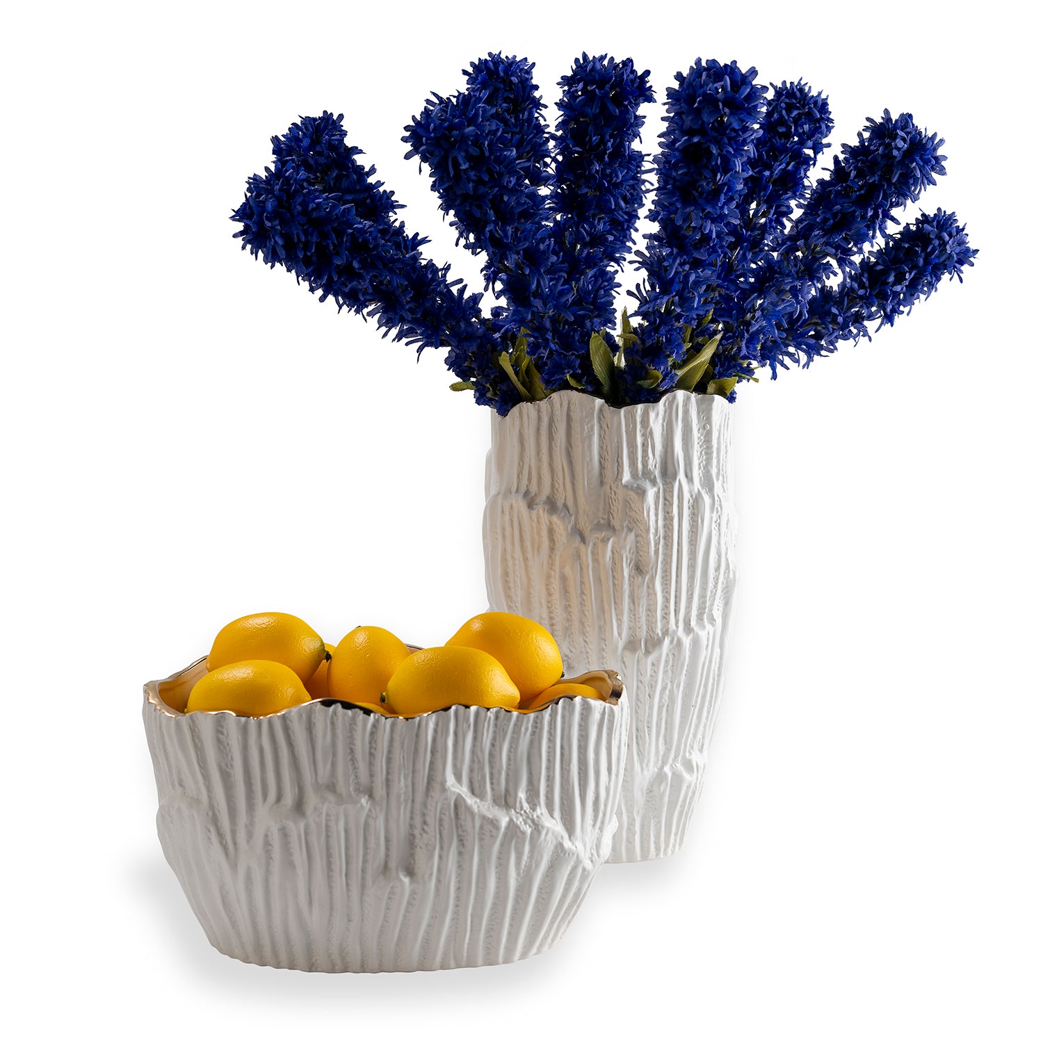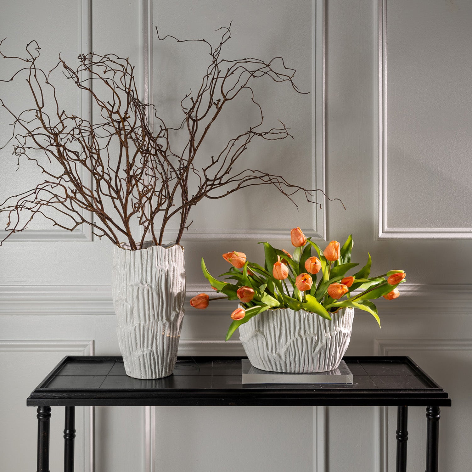 Sculptural and modern, the Havana tall vase depicts the texture and movement of a palm frond at the beach. The white glazed porcelain vase holds water for displaying a botanical arrangement or branches.