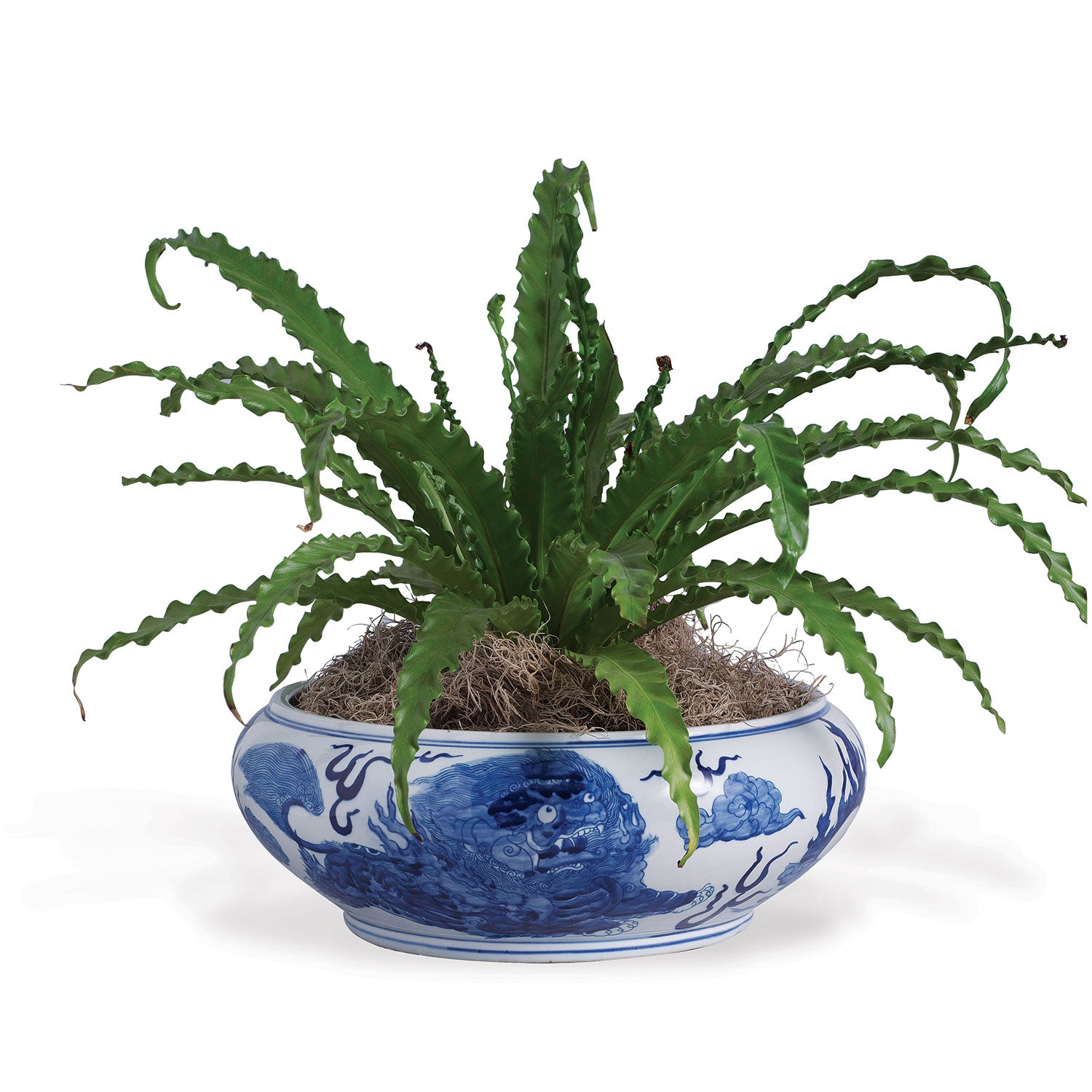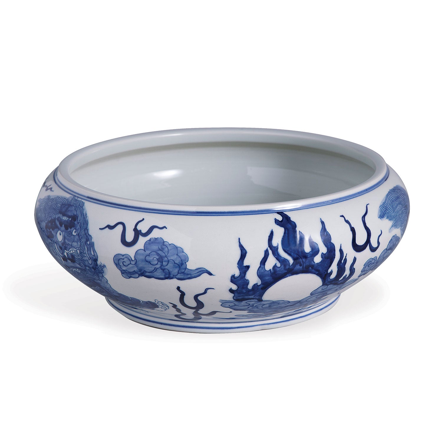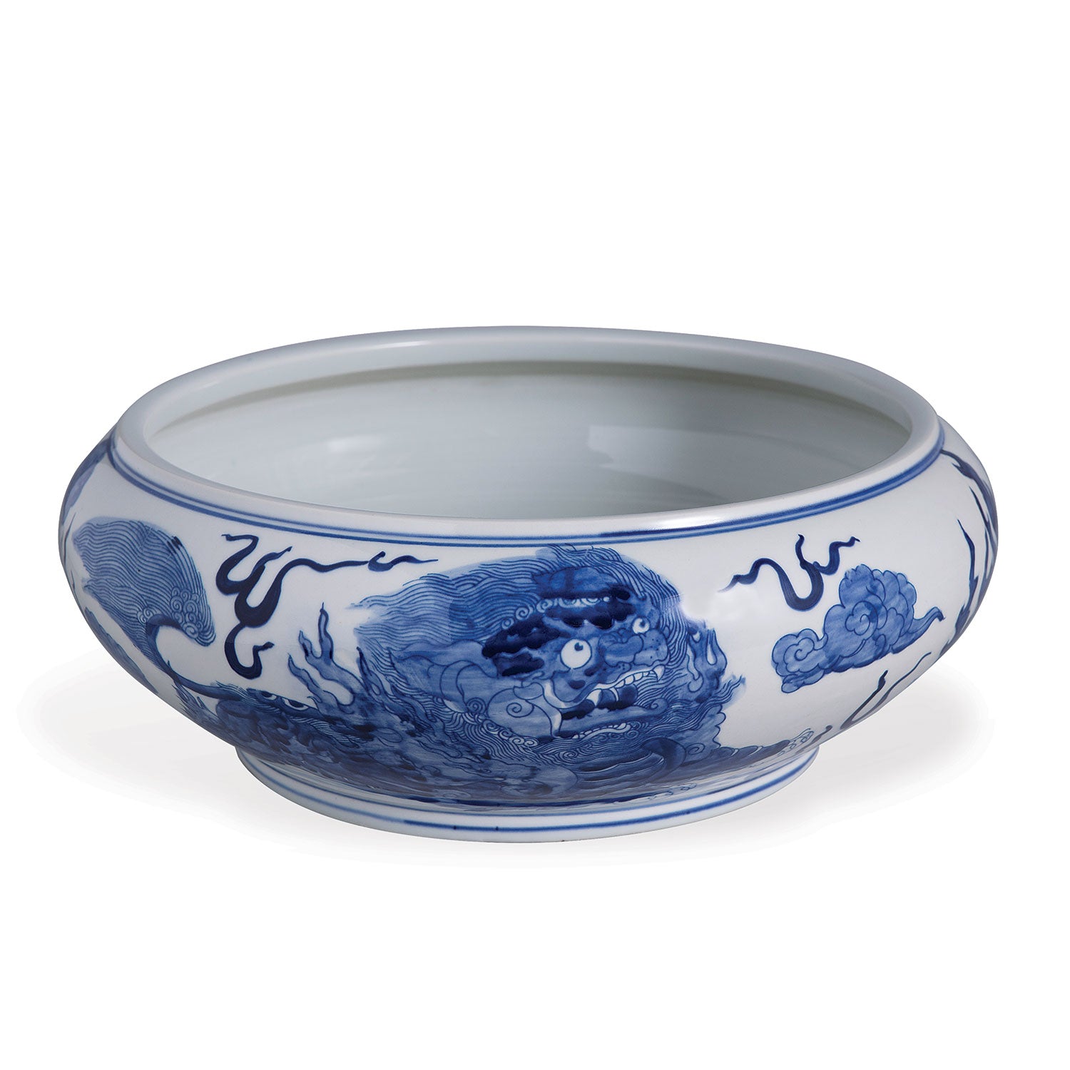 Classic round, low center basin holds water for your florals or plants. We love how the foo dog is painted on the basin.
