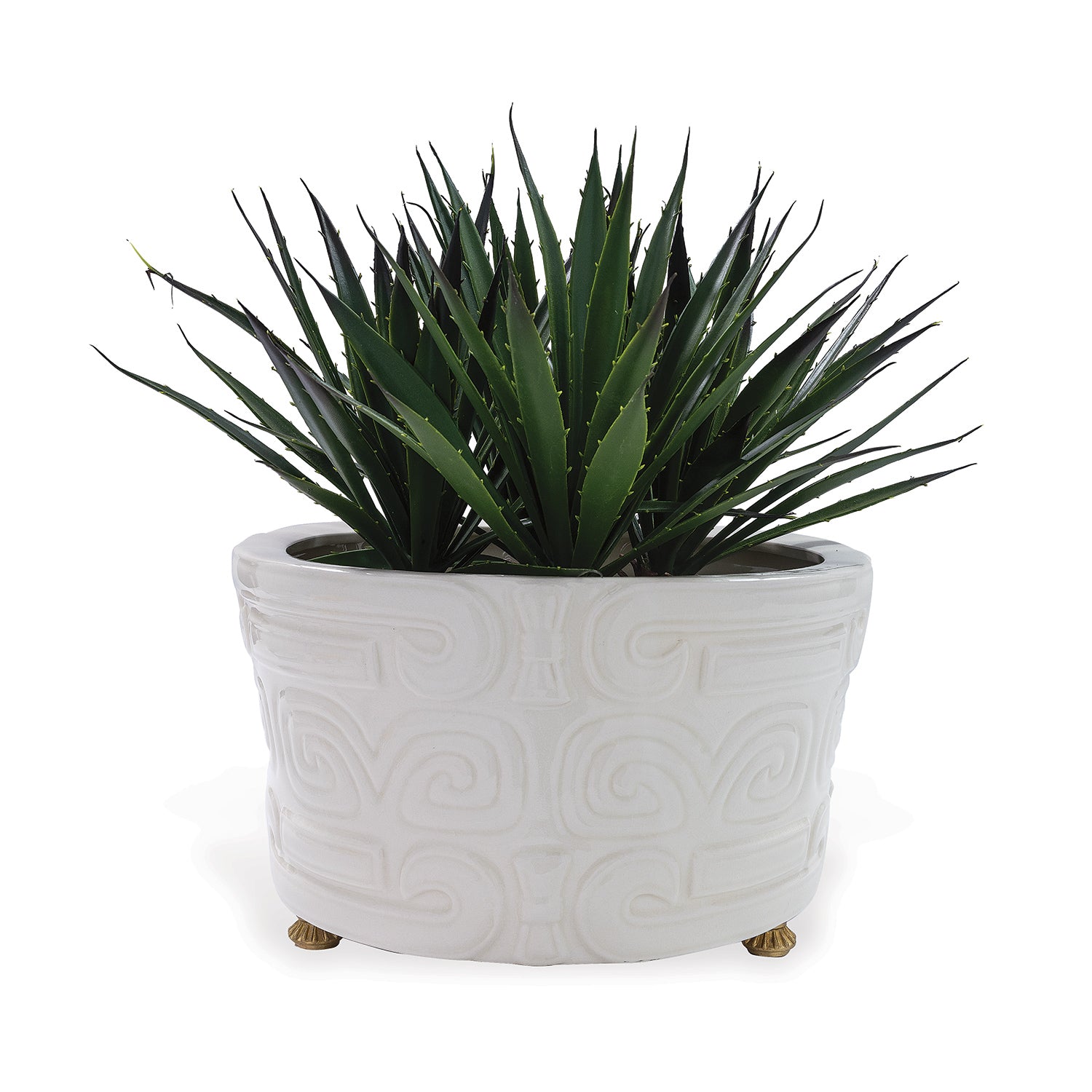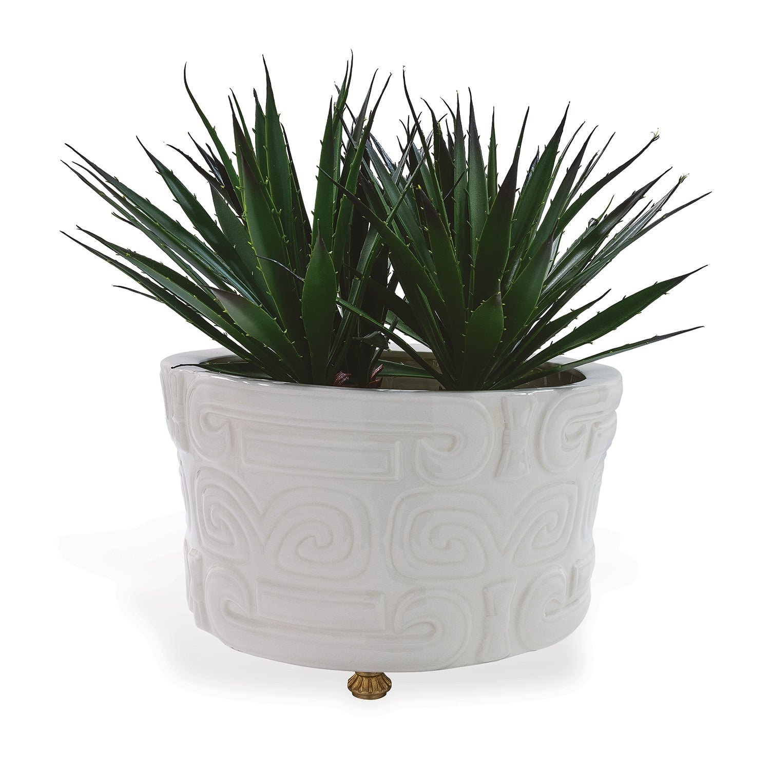 Dynasty is our Tibetan inspired pattern and carvings which are cast into the porcelain center basin. The center basin or planter may be used for fresh flowers or plants. The basin is resting on solid brass feet to elevate it off the table. Available in cream and celadon translucent glazes.