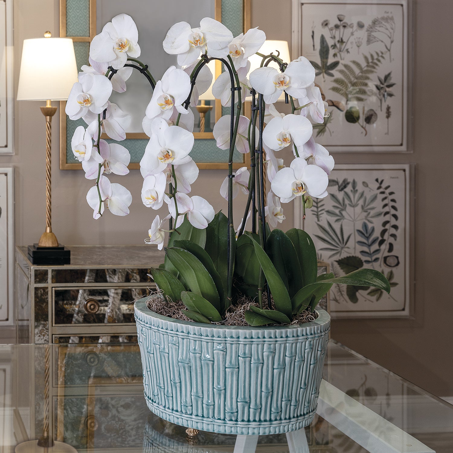 Accented with solid brass feet, the center basin features carved bamboo into the mold of the porcelain planter. Basin is available in cream and celadon glazes.