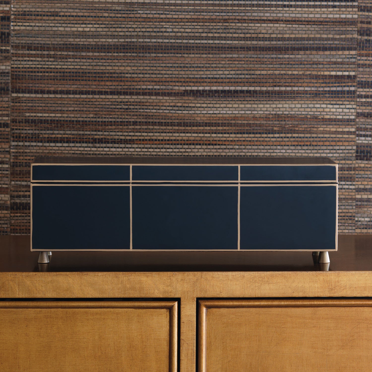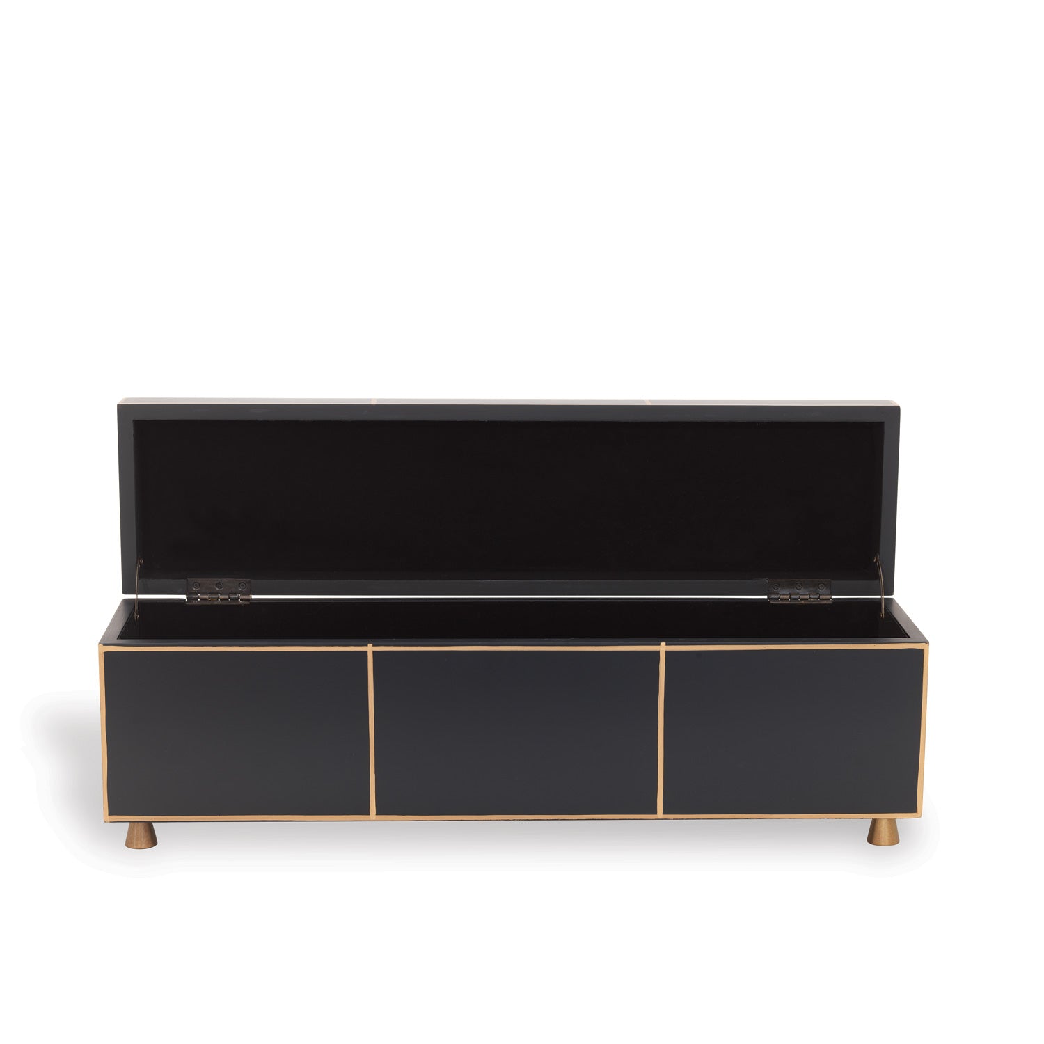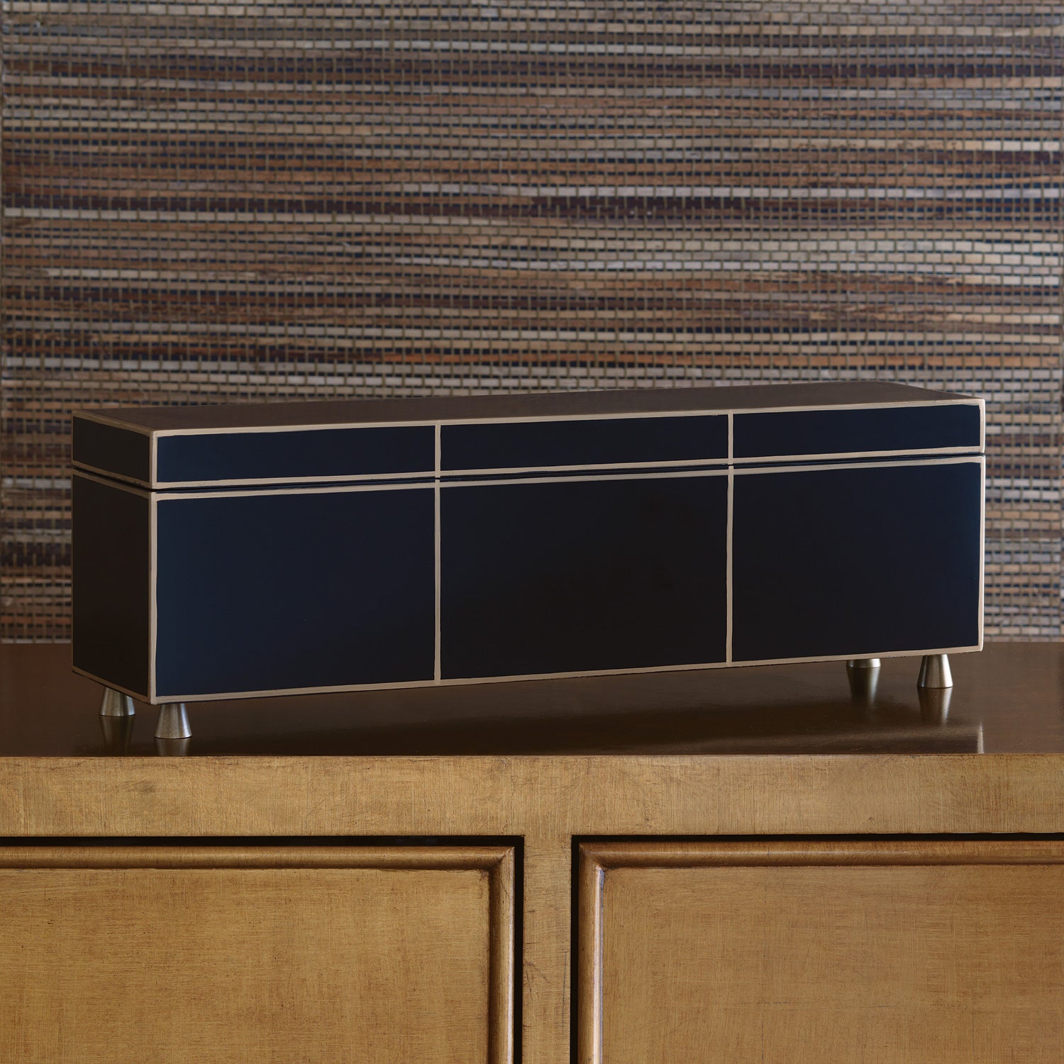 Modern mantle box with mid century style cone brass feet. Velvet lined interior. Lift up top with hinge. Scaled for your mantle, sideboard or coffee table. Wonderful hidden storage for media remotes, wallets and keys.