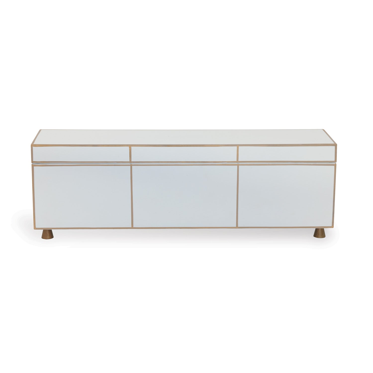 Modern mantle box with mid century style cone brass feet. Velvet lined interior. Lift up top with hinge. Scaled for your mantle, sideboard or coffee table. Wonderful hidden storage for media remotes, wallets and keys.