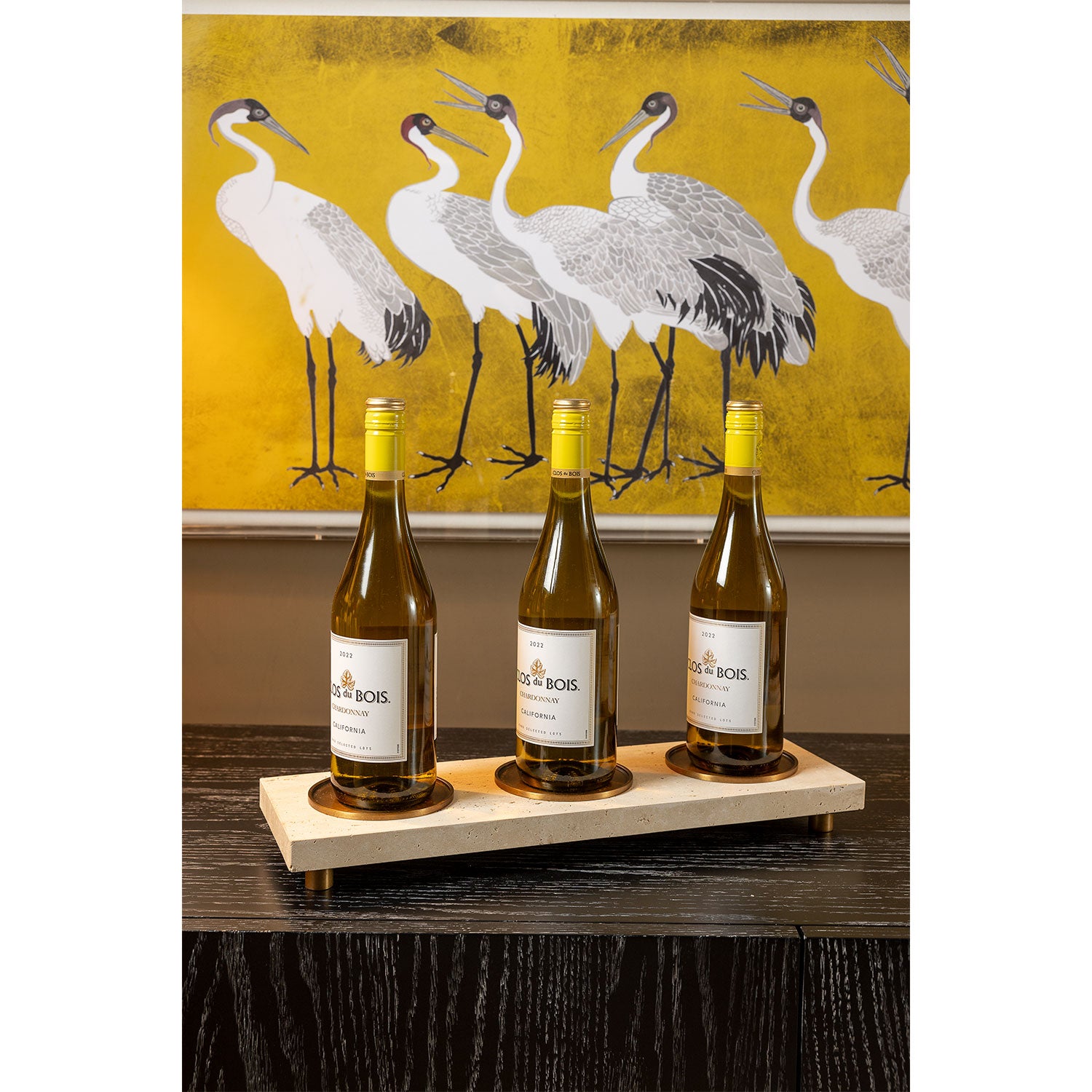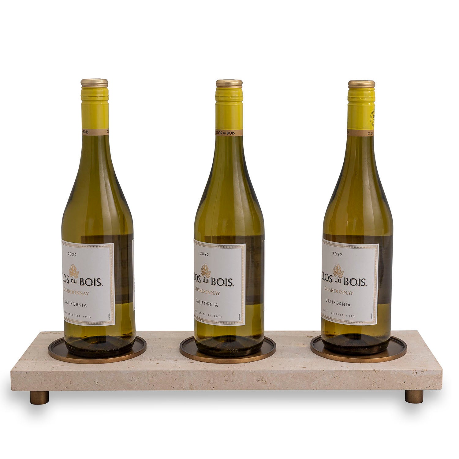 Natural unpolished stone marble is accented with aged brass finished metal hardware for this modern candleholder / tray called Tivoli. The natural stone has a patina and raw, natural detail. Simple, casual and ever so modern, this stone candleholder / tray is scaled for the dining table or console. We like to use with a flight of wine, pillar candles or even showing off your collection of figurines.