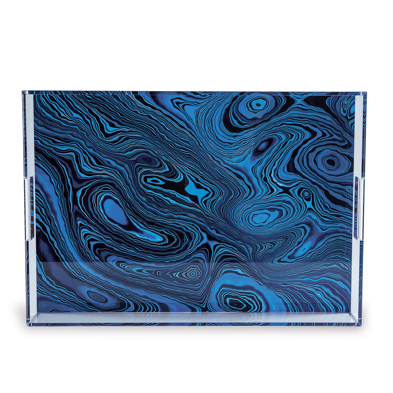 Dramatic blue malachite is a striking pattern on our rectangular tray. The malachite pattern is screened on the reverse of the bottom of the lucite tray.