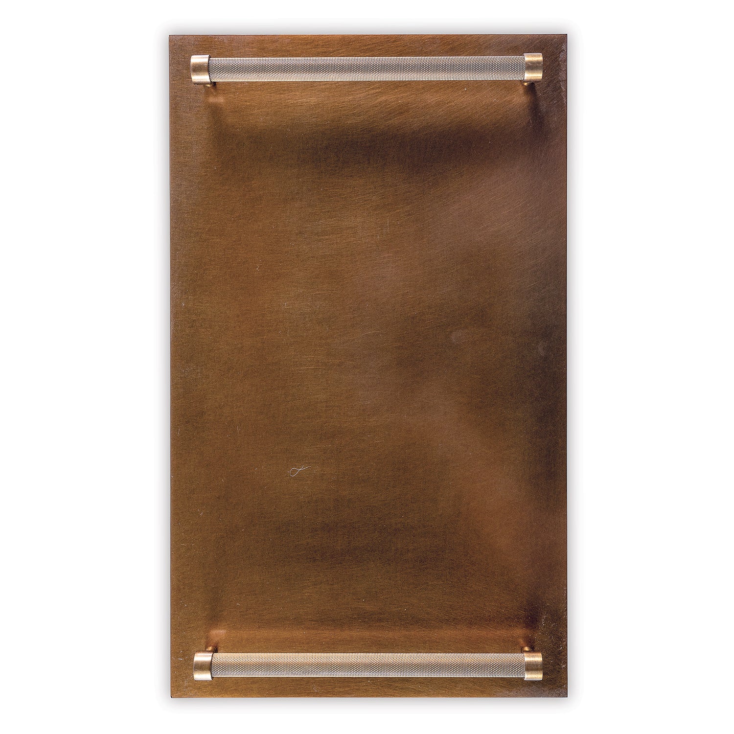 Modern entertaining and display is elevated with the solid metal tray finished in aged brass--complete with knurled metal turning handles. Round turned metal feet.