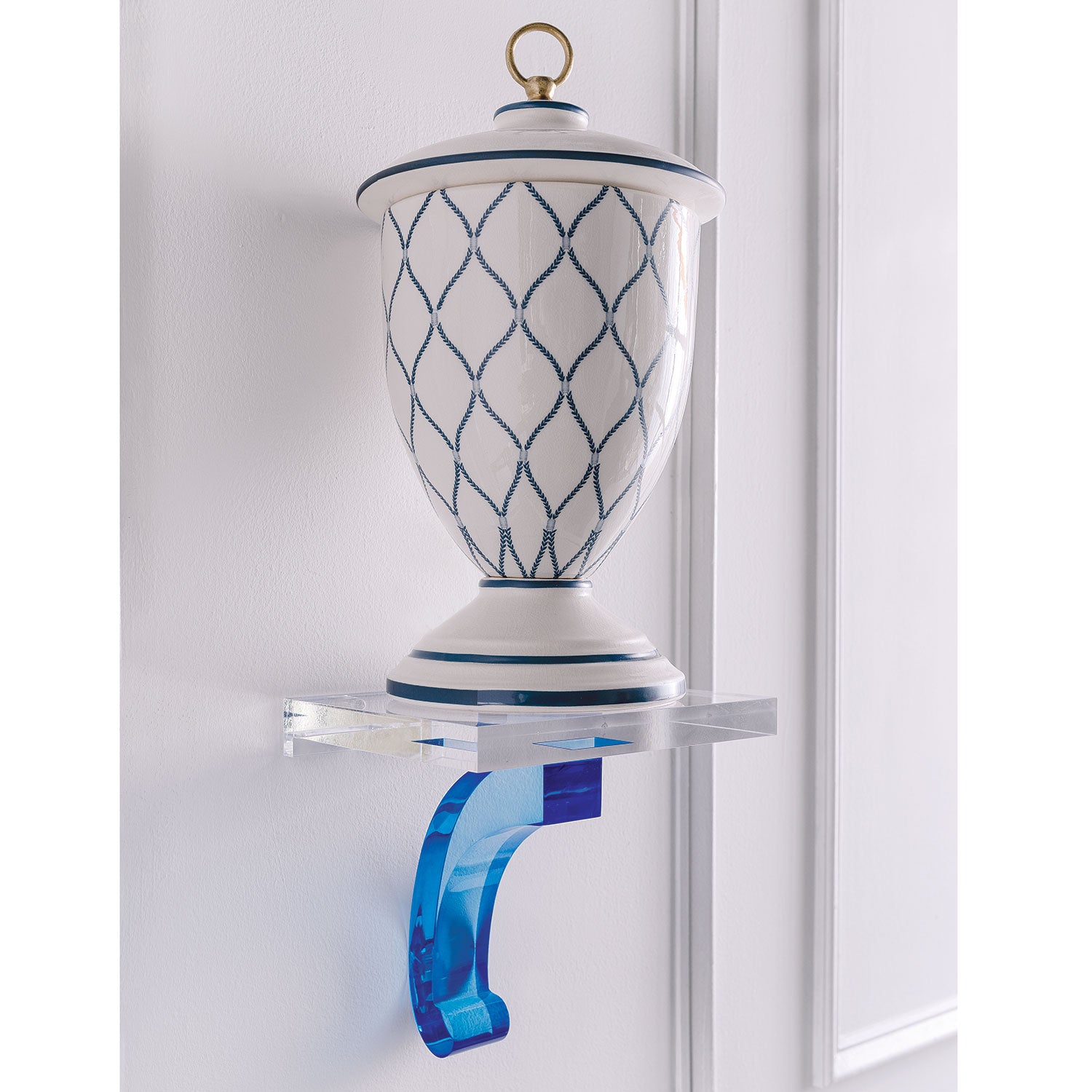 Glencoe is our chic, solid lucite wall shelf that disappears on the wall--but has a pop of color with the bottom support in translucent blue. The objet or jar is the feature when placed on this shelf. Predrilled holes on the bottom rail make mounting easy to the wall, and ever so discrete.