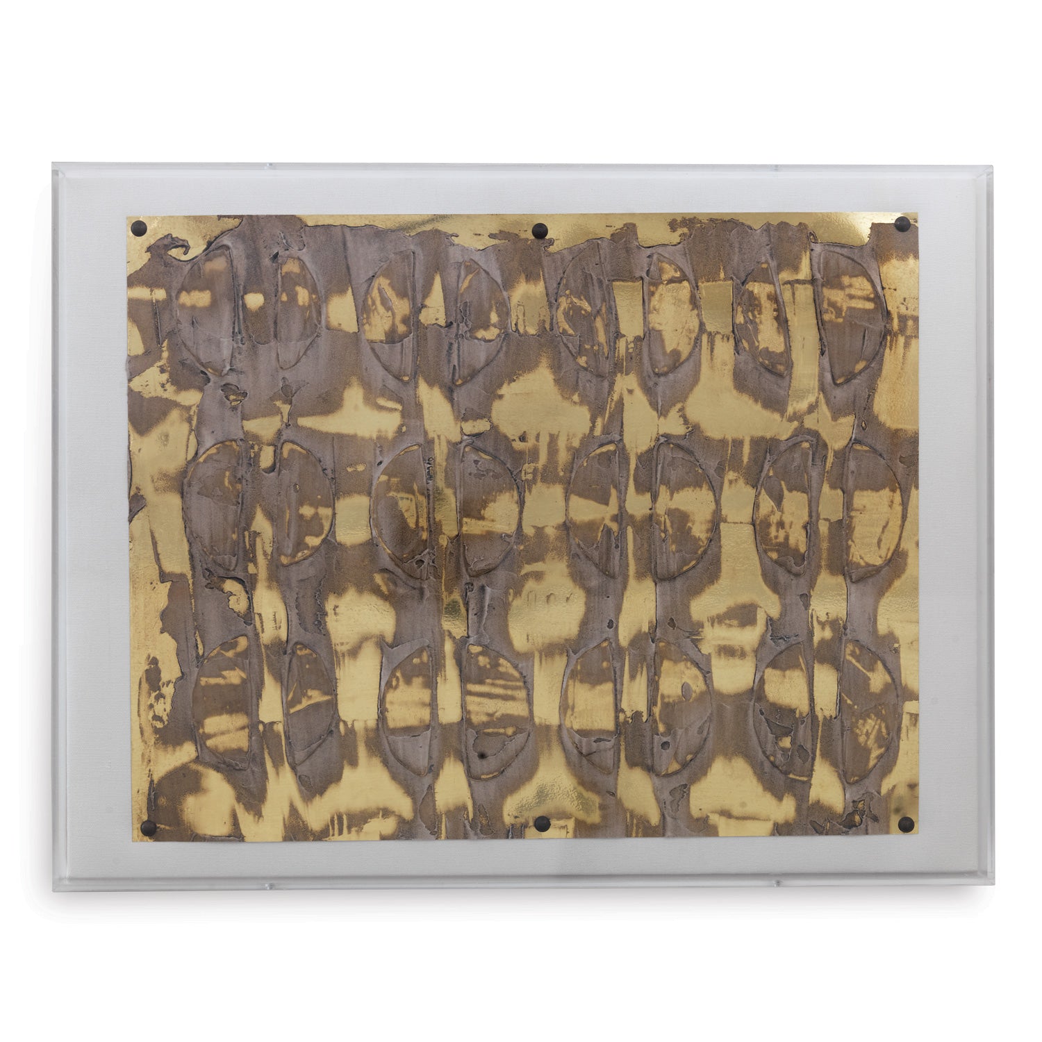 Our modern multi-original artwork is mounted under a 2.5" deep lucite shadow box. Attached to a linen wrapped interior panel, the foil finished original artwork is finished with black nail head in each corner.