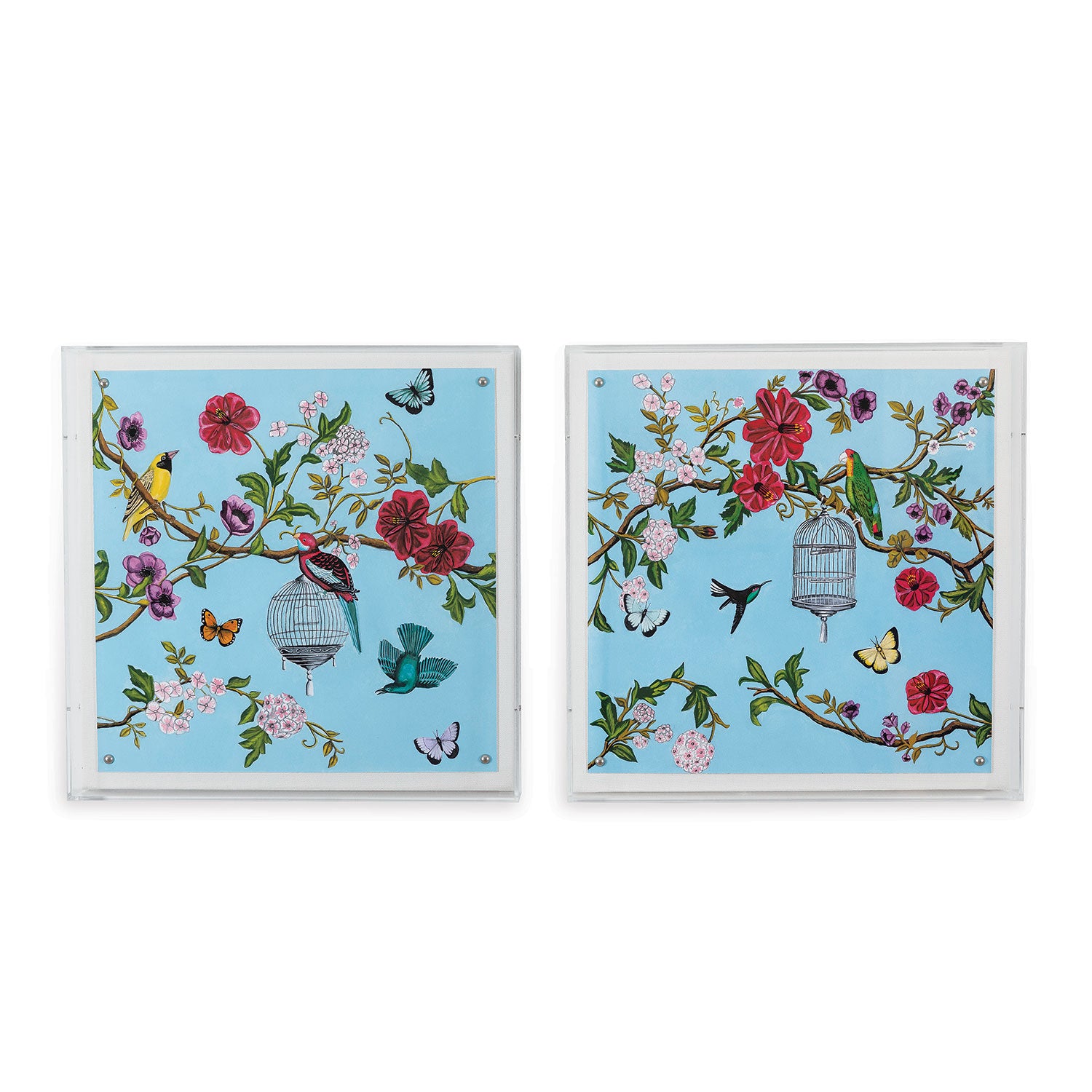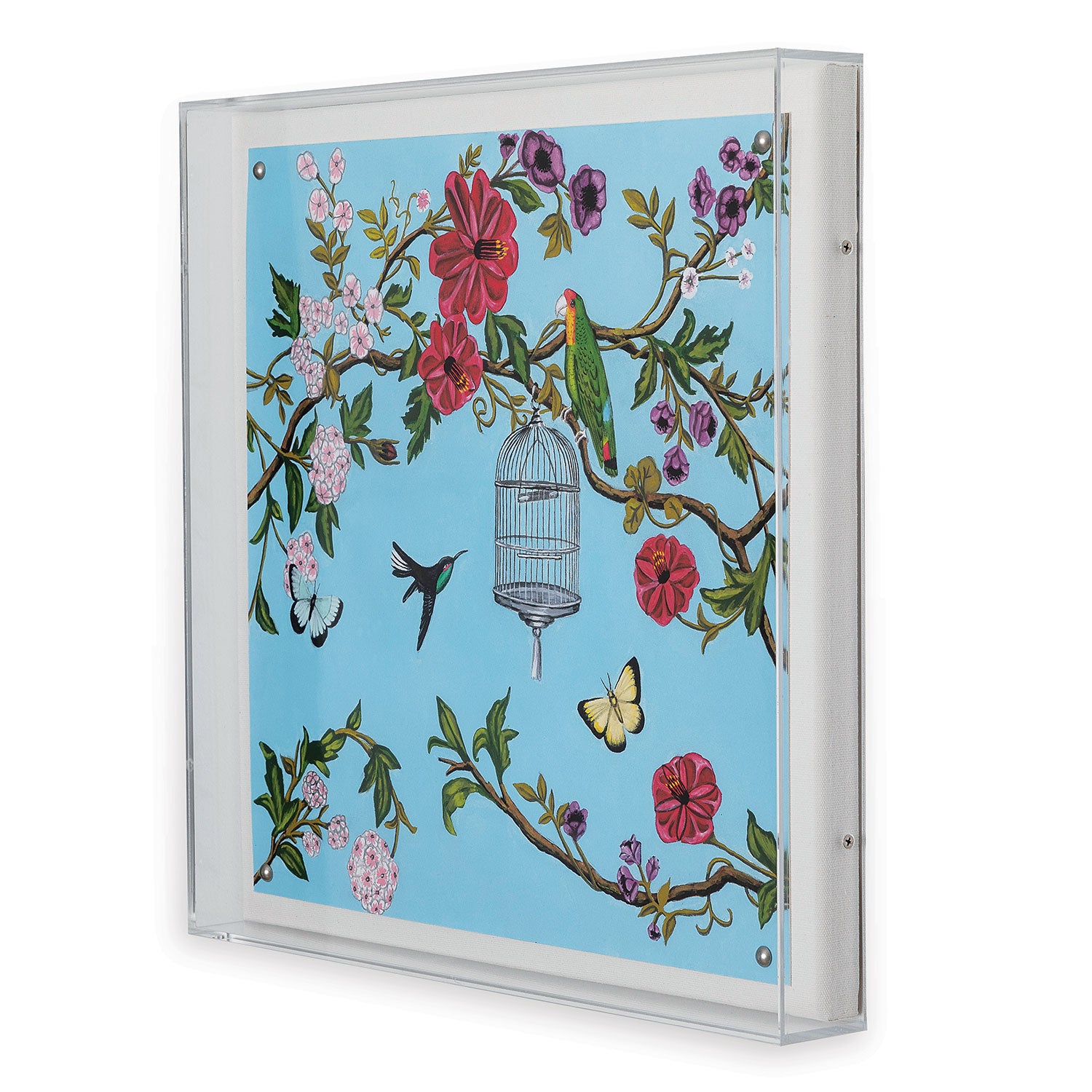 Whimsical folly of birds, flowers, birdcages and butterflies are depicted in the "Bird Song" pair of framed artwork. Mounted under a lucite shadowbox frame, the series of birds and vines connect when shown as a pair. The artwork is a reproduction from the original painting in giclee.