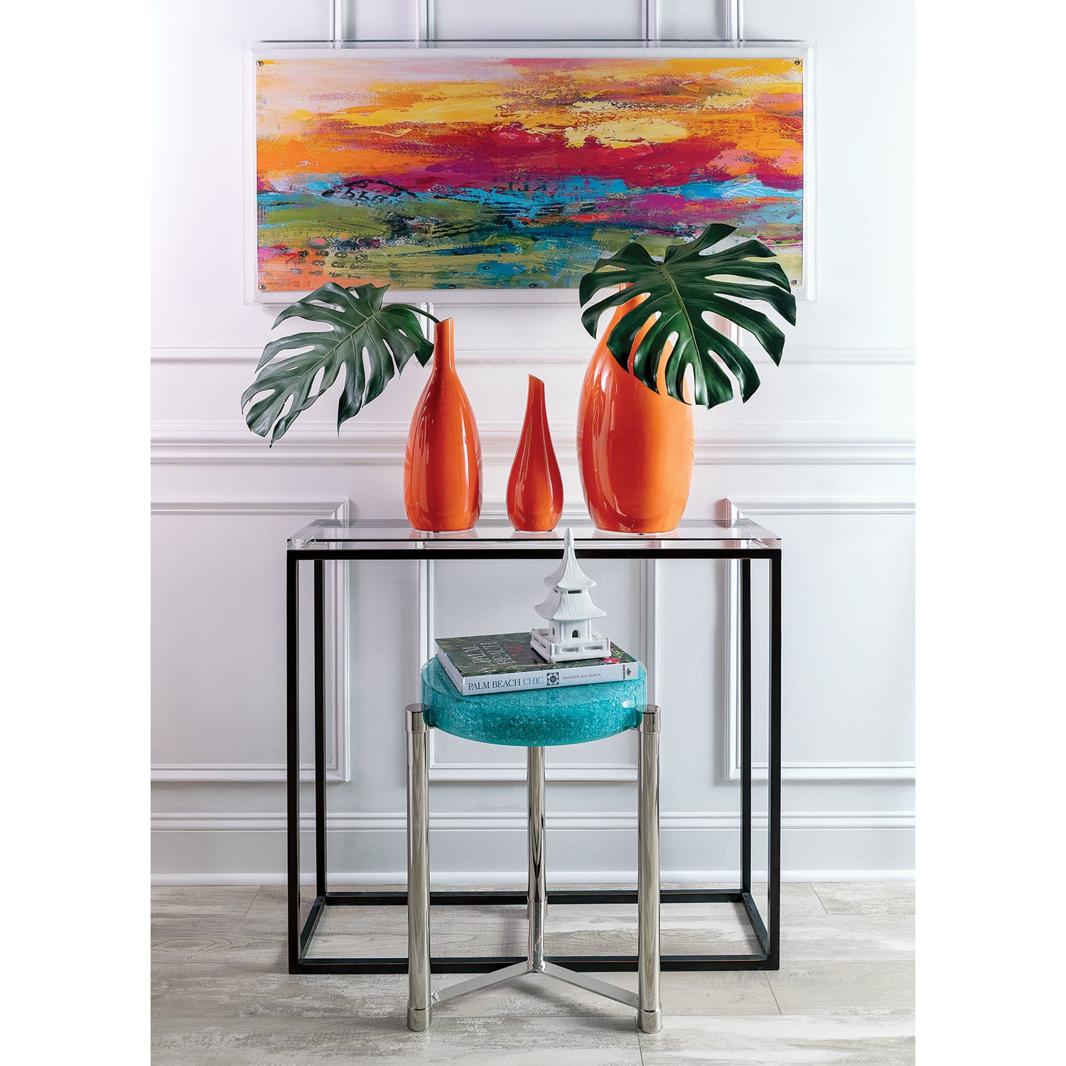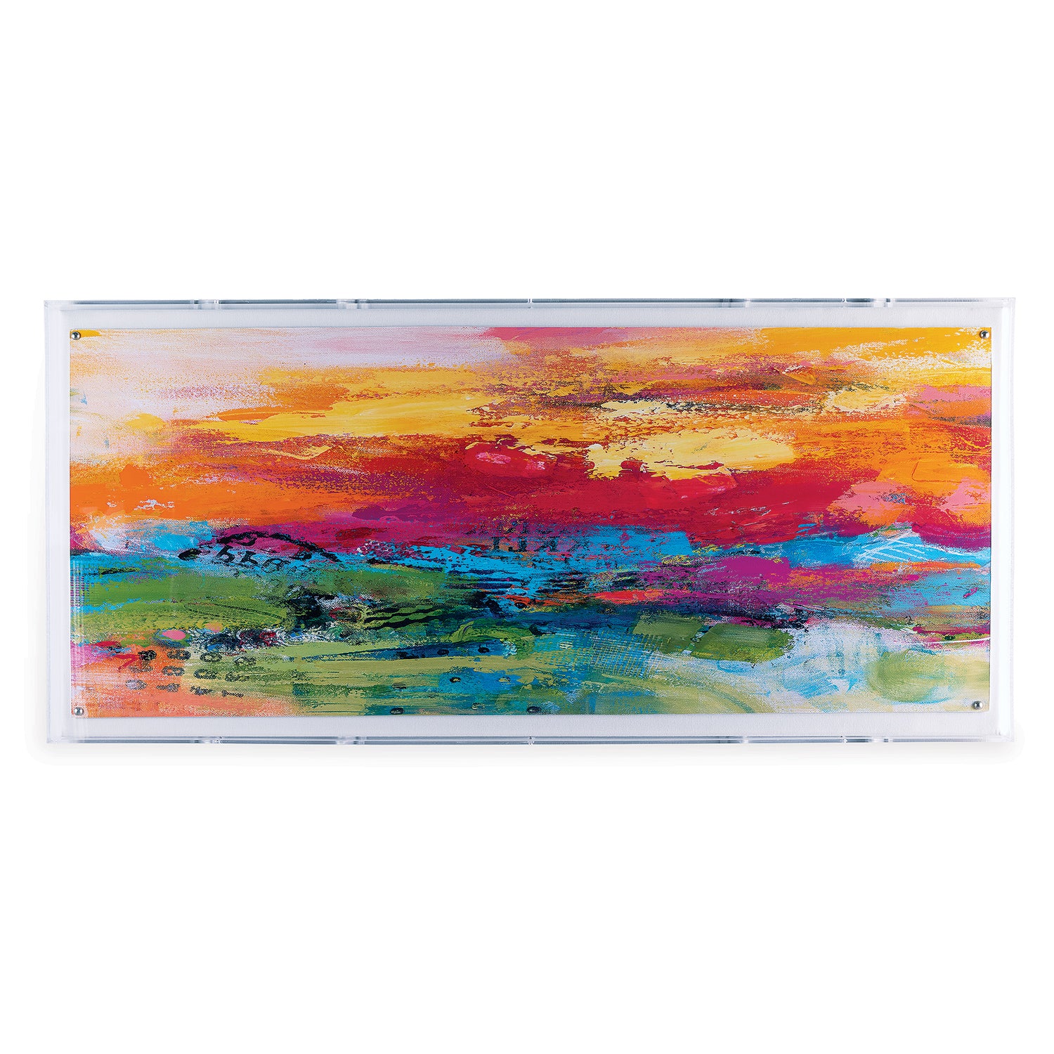 We love the bold layers of color in our artwork named Delight. It is a colorful and expressive landscape. We have chosen to hang the print horizontally, but you may move the D-rings on the back to make this framing vertical.