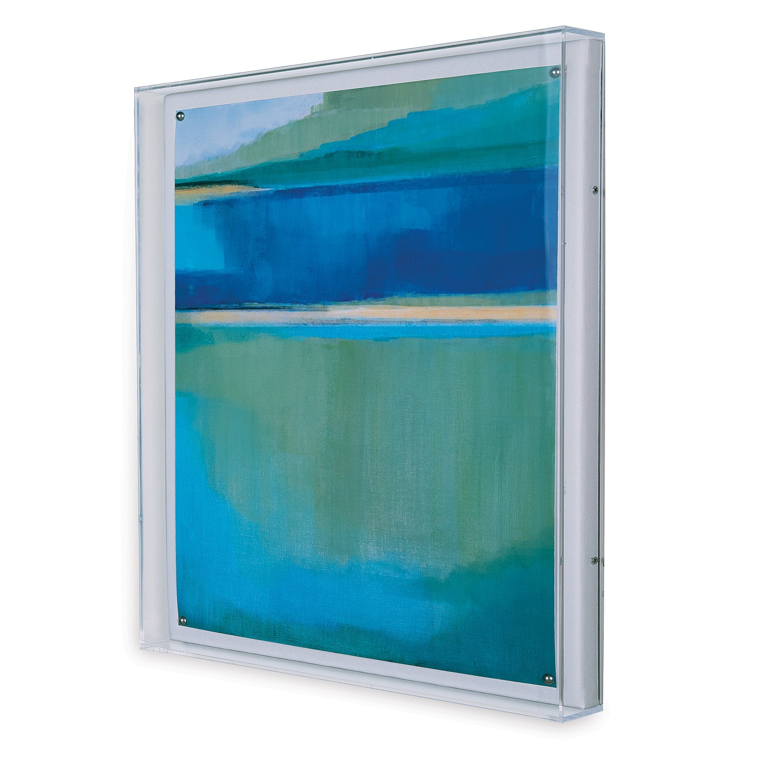 Framed under an lucite shadowbox frame, the giclee print is mounted to a linen/cotton fabric wrapped interior panel.