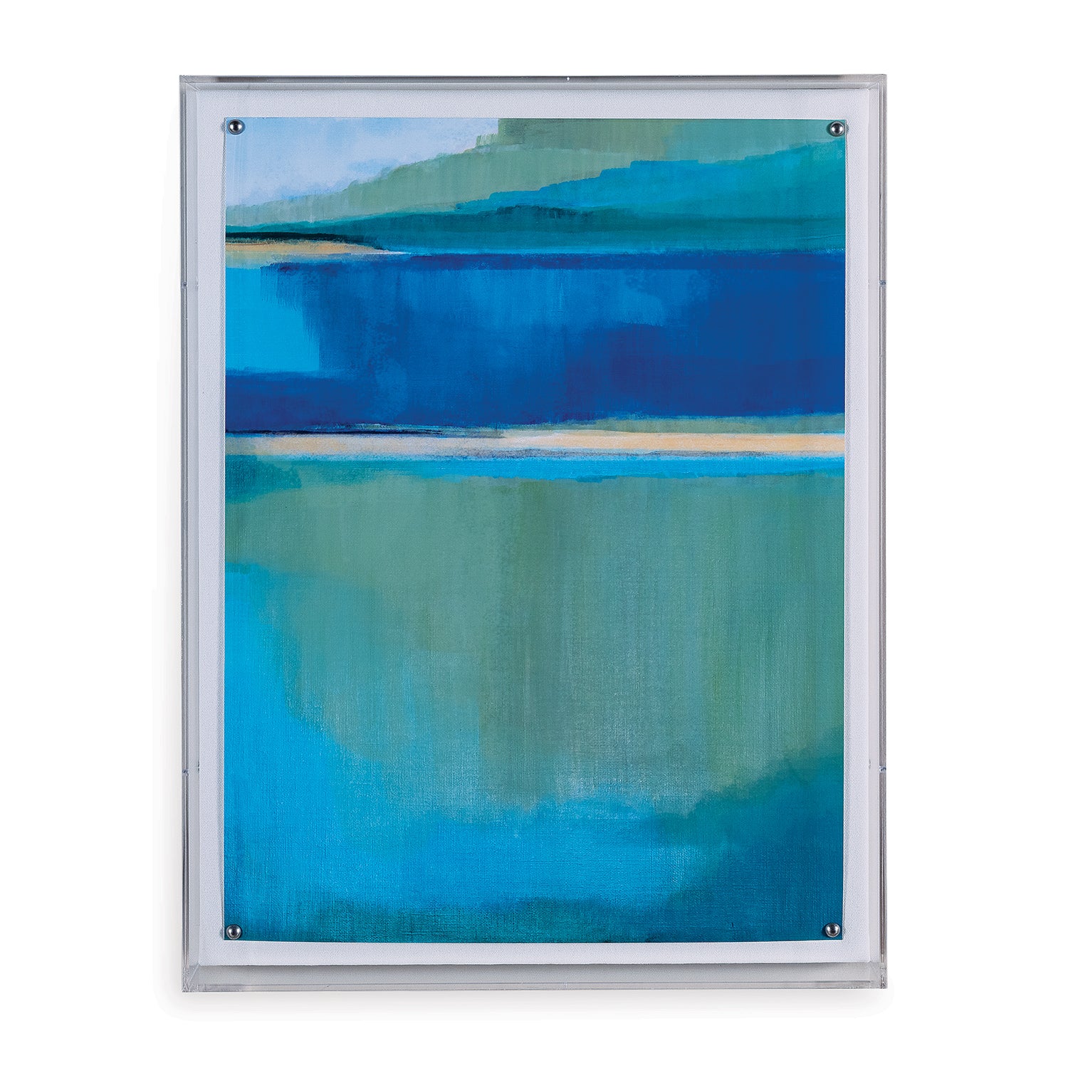 Lagoon is inspired by a pastoral lakeside scenic on a mountains edge. Colors of greens, blues and accents of yellows make this pair of artwork a calming view on your wall.