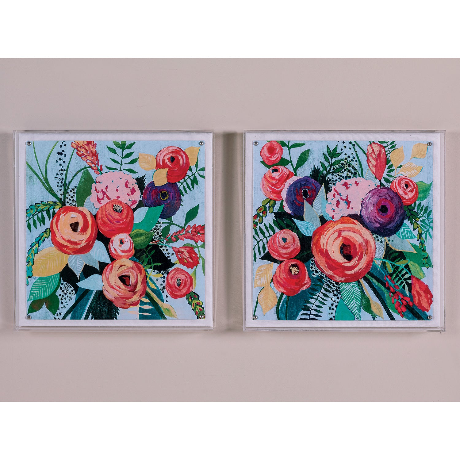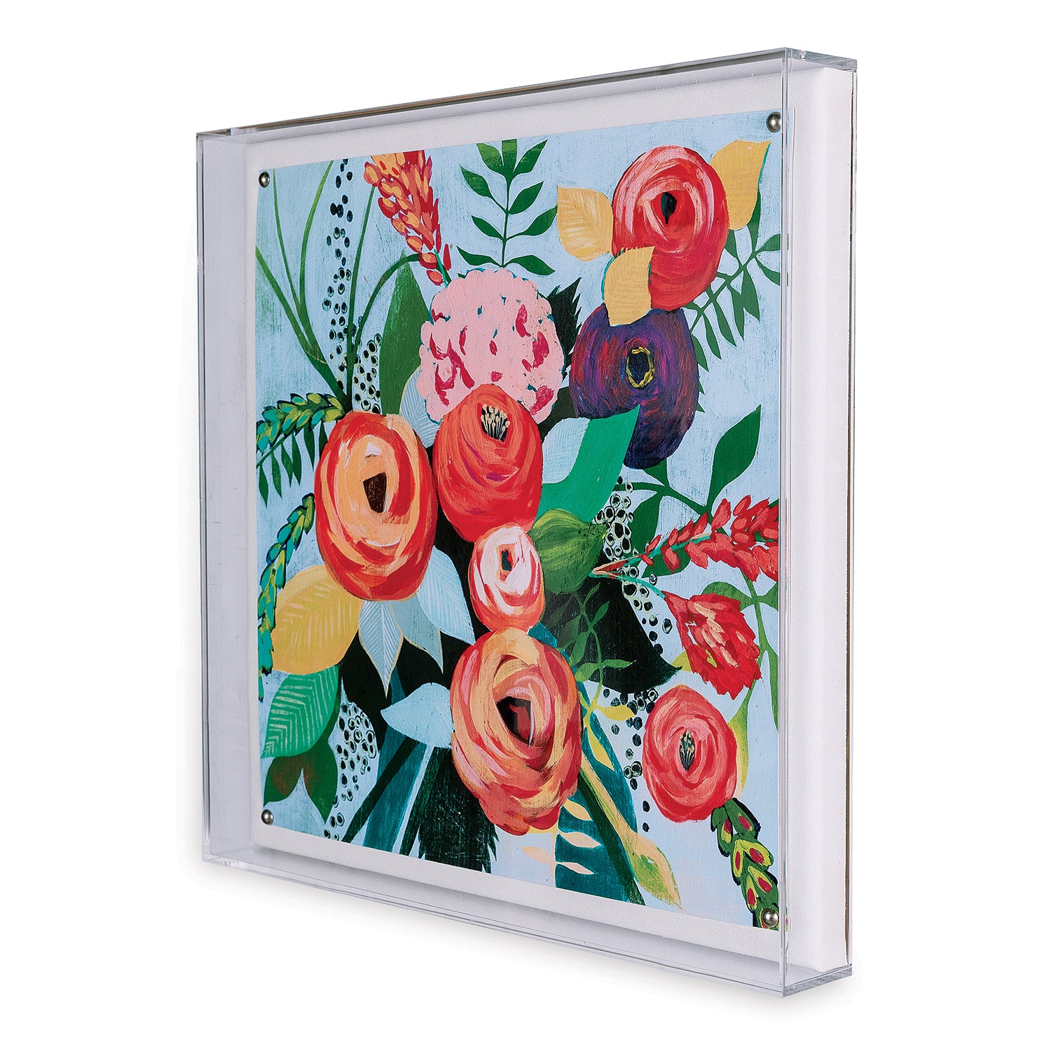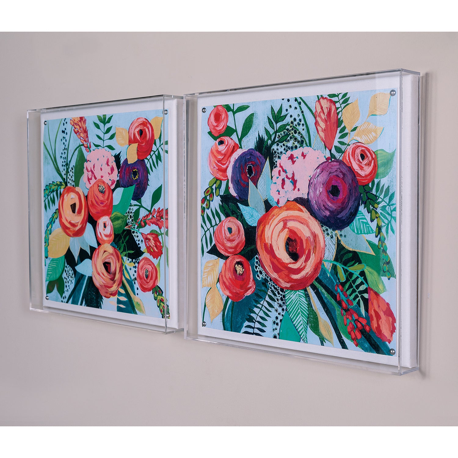 Exuberant & colorful painterly flowers are showcased in the square artwork. The giclee print is mounted under a 2.5" deep lucite shadow box. Attached to a cotton/linen wrapped interior panel, the artwork is finished with a nickel finished nail head in each corner.