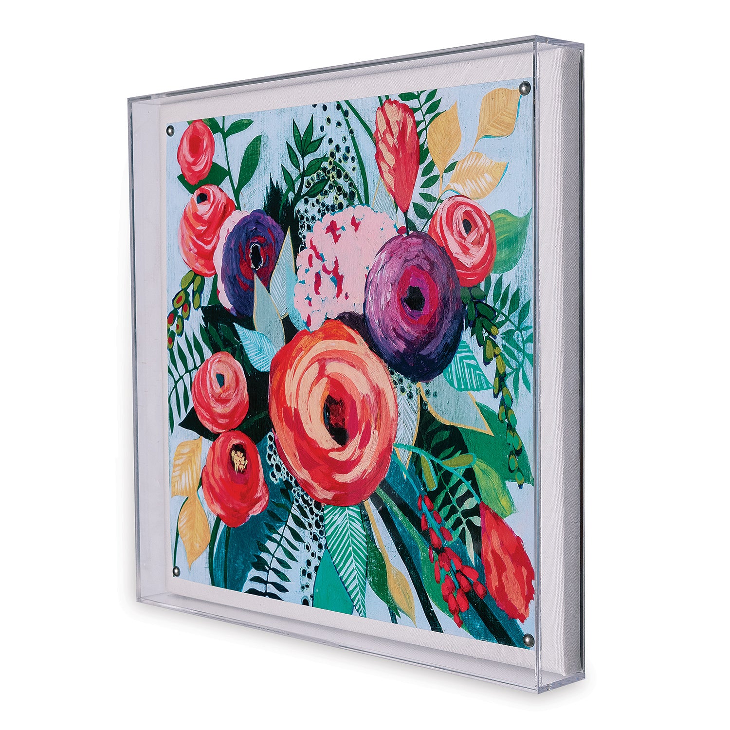 Exuberant & colorful painterly flowers are showcased in the square artwork. The giclee print is mounted under a 2.5" deep lucite shadow box. Attached to a cotton/linen wrapped interior panel, the artwork is finished with a nickel finished nail head in each corner.