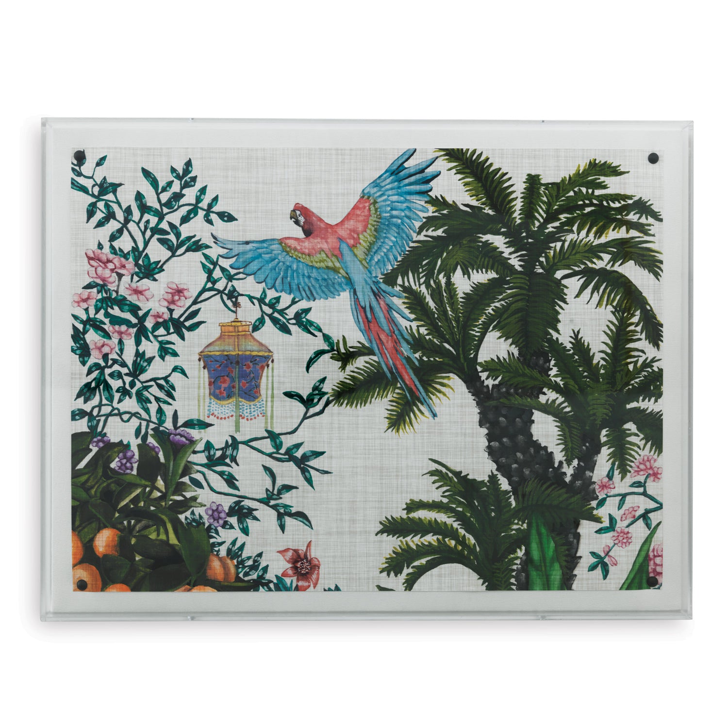 Whimsical and colorful tropical panels, our artwork collection features a giclee print mounted under a 2.5" deep lucite shadow box. Attached to a linen wrapped interior panel, the artwork is finished with black nail head in each corner.