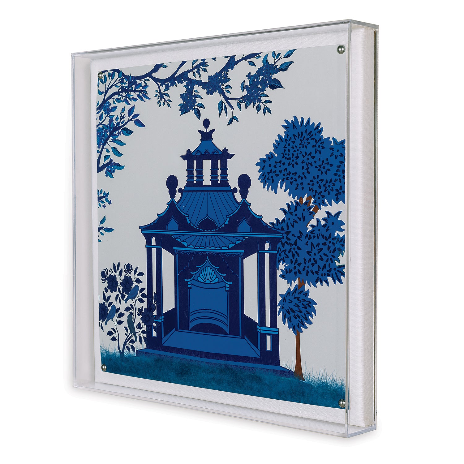 Pagoda is a bold blue depiction of a whimsical pagoda in color. Mounted under a shadowbox frame, the giclee print is finished with nail head studs in each corner.