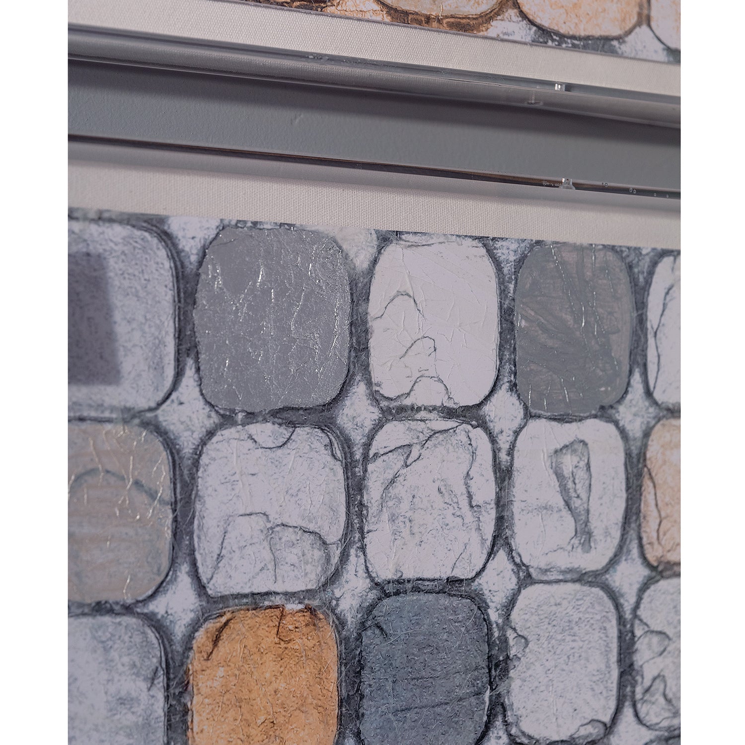 Rounded squares of pewter, gunmetal and silver color with punches of gold depict this modern artwork. The giclee print is a reproduction from the original. It is hand embellished randomly with silver leaf and textured paper to give the extra dimension on the wall.