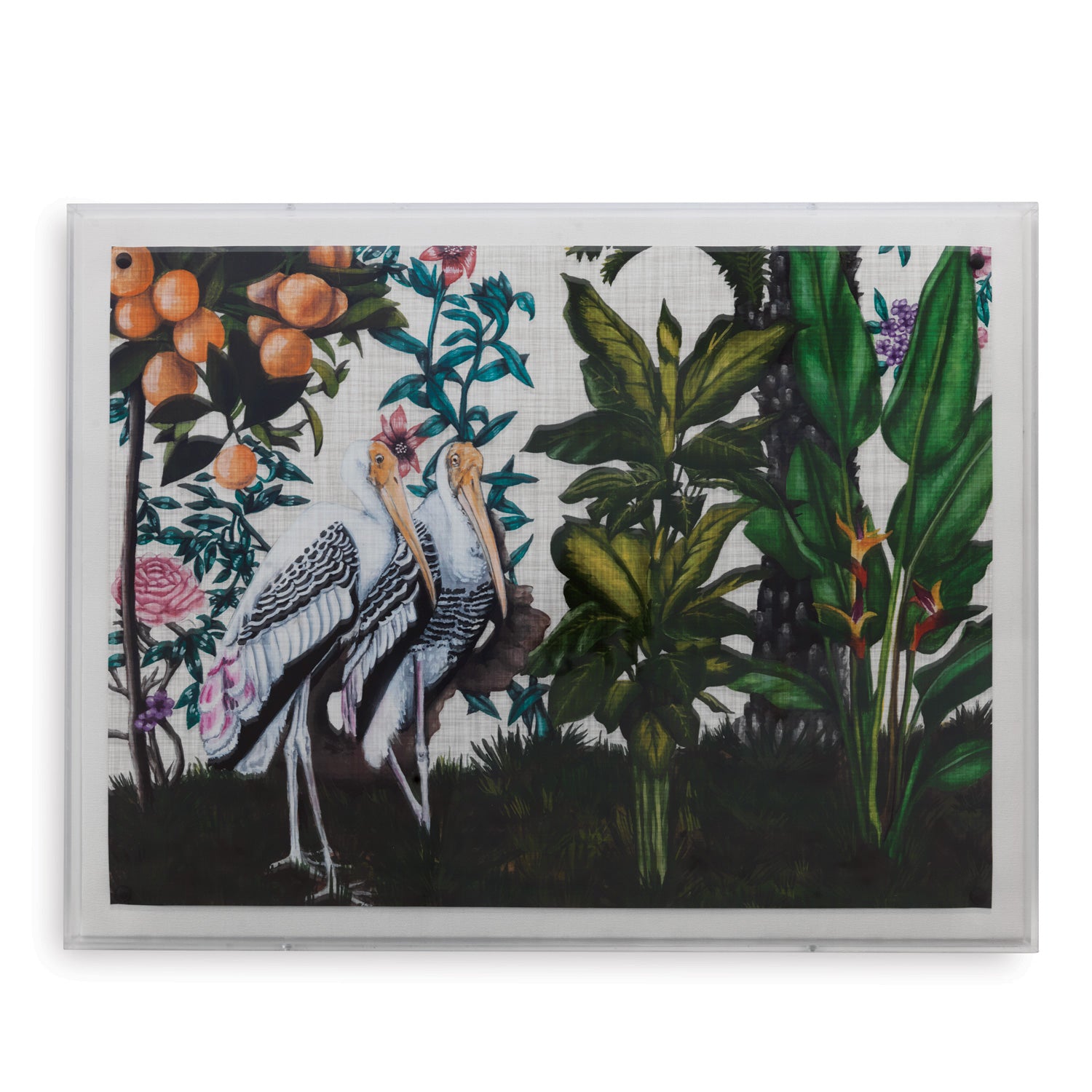Whimsical and colorful tropical panels, our artwork collection features a giclee print mounted under a 2.5" deep lucite shadow box. Attached to a linen wrapped interior panel, the artwork is finished with black nail head in each corner.