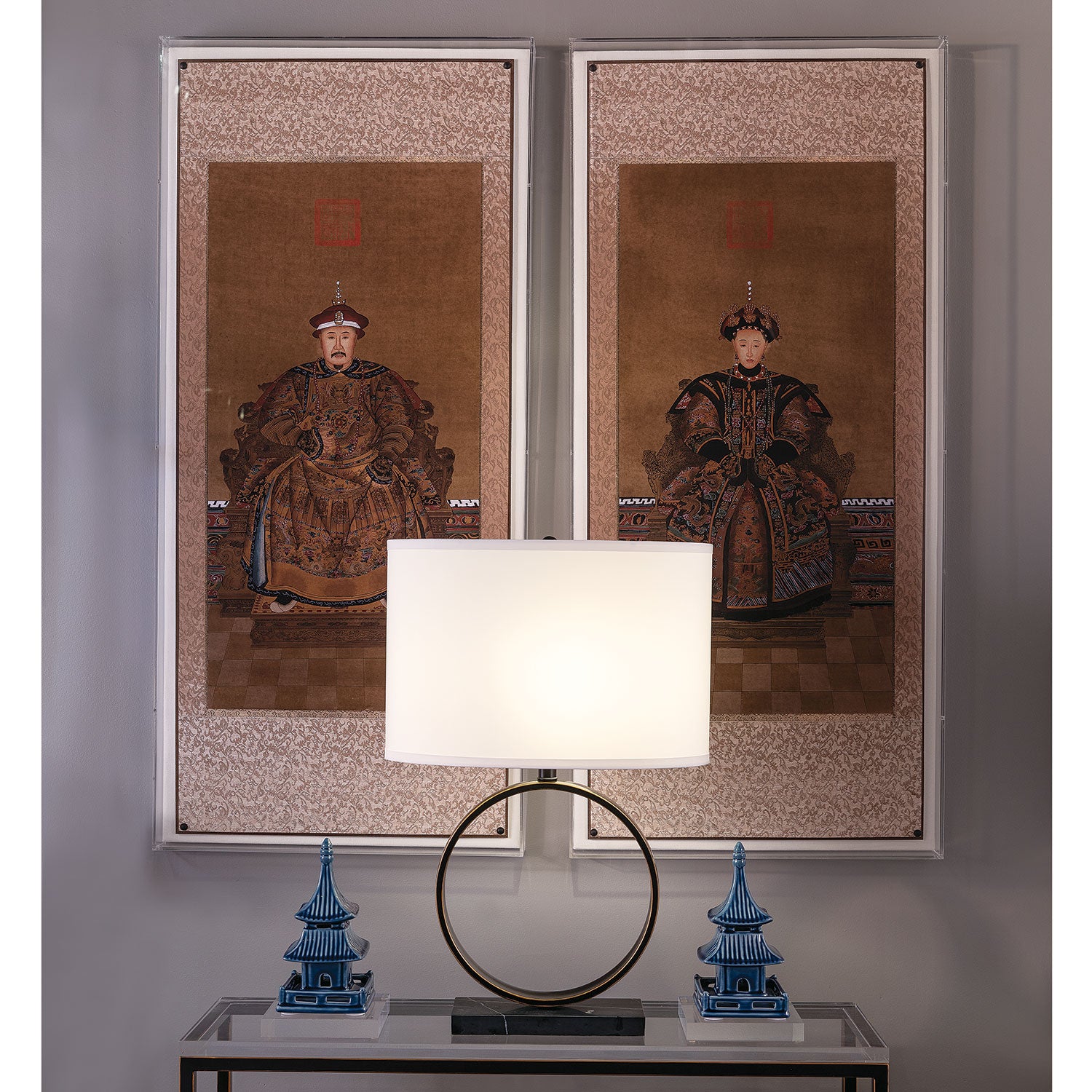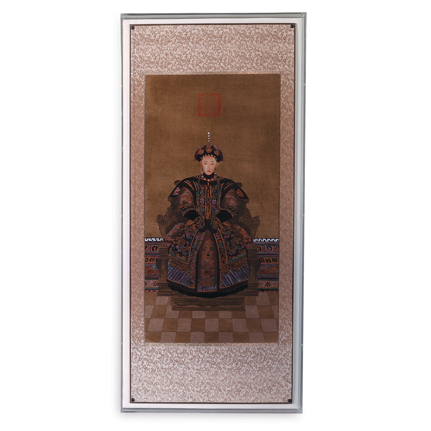 Emperor and Empress are reproduced from rich and colorful antique hand painted ancestral panels that we found in Beijing that were mounted on silk fabric rolls. Our interpretations are giclee printed and mounted inside the shadowbox panels.