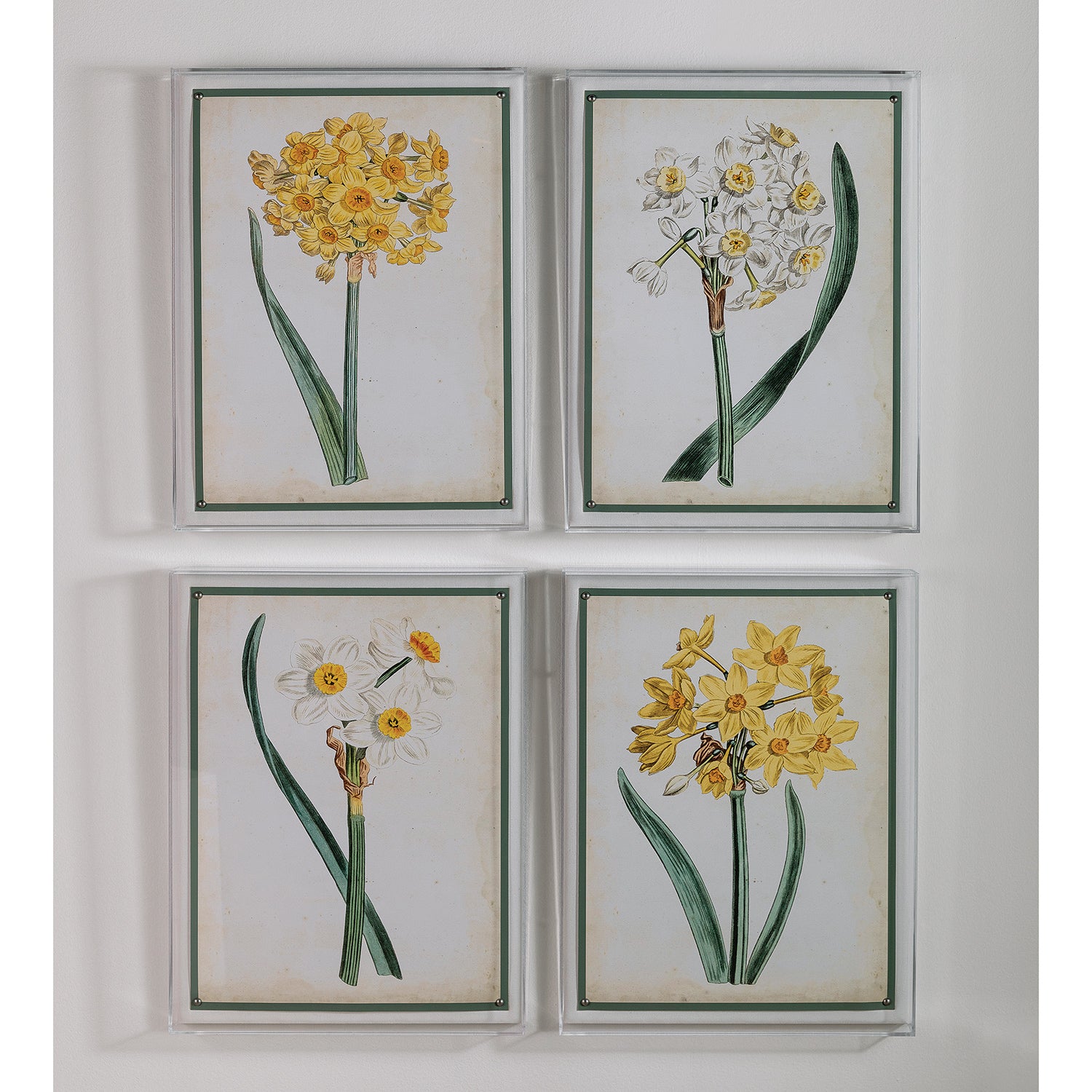 Our Narcissus artwork collection features a giclee print mounted under a 2.5" deep lucite shadow box. Attached to a linen wrapped interior panel, the artwork is accented with nickel finished nail head in each corner.