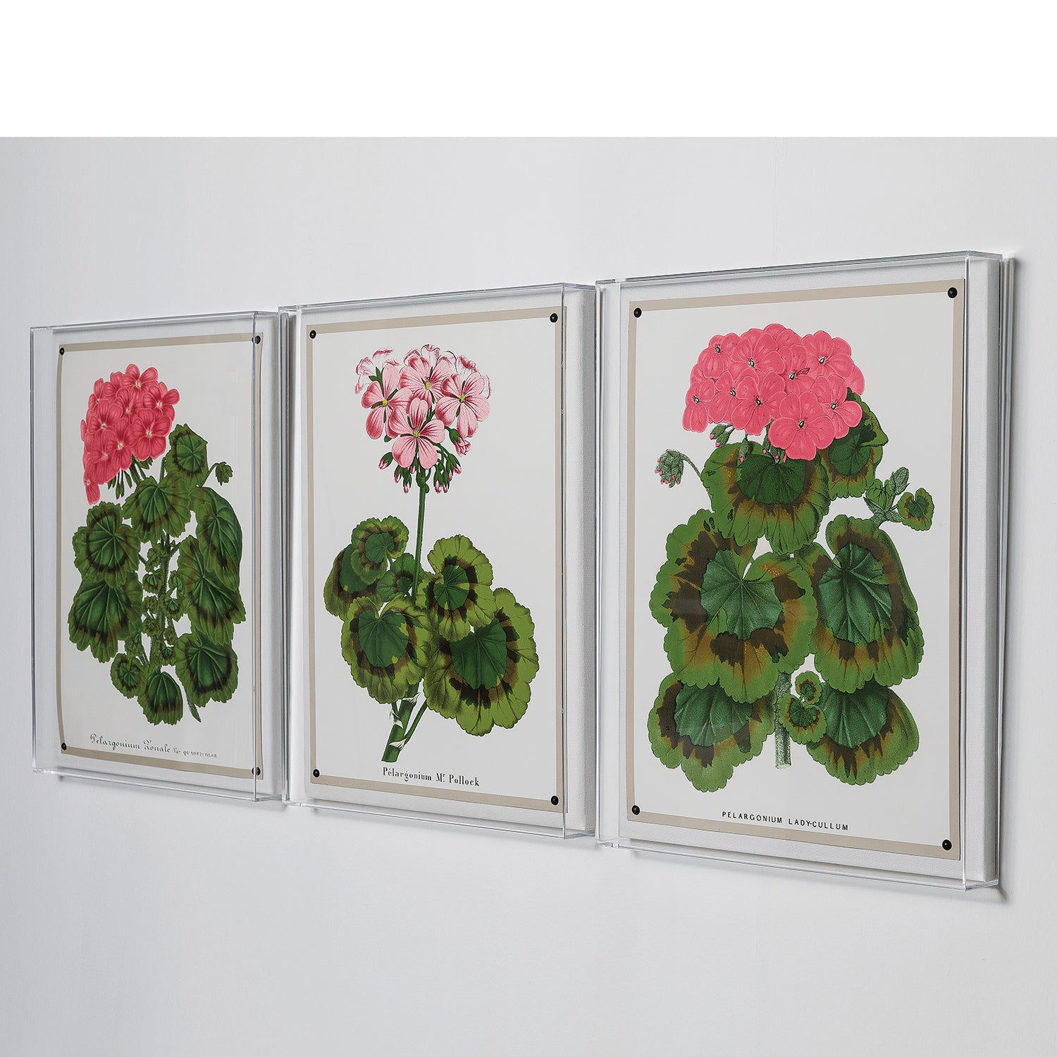 Our Geranium artwork collection features a giclee print mounted under a 2.5" deep lucite shadow box. Attached to a linen wrapped interior panel, the artwork is accented with black finished nail head in each corner.
