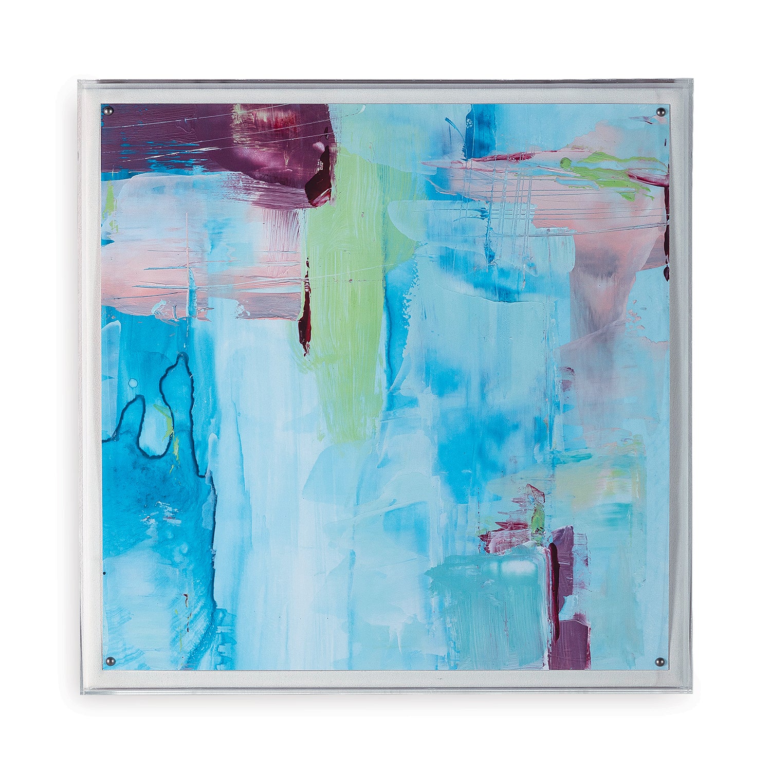 Our pastel abstract expressionism artwork collection features a giclee print mounted under a 2.5" deep lucite shadow box. Attached to a linen wrapped interior panel, the artwork is finished with nickel nail head in each corner. Each of the giclee prints feature a wash of pastel pink, green and turquoise blues for a profusion of color.
