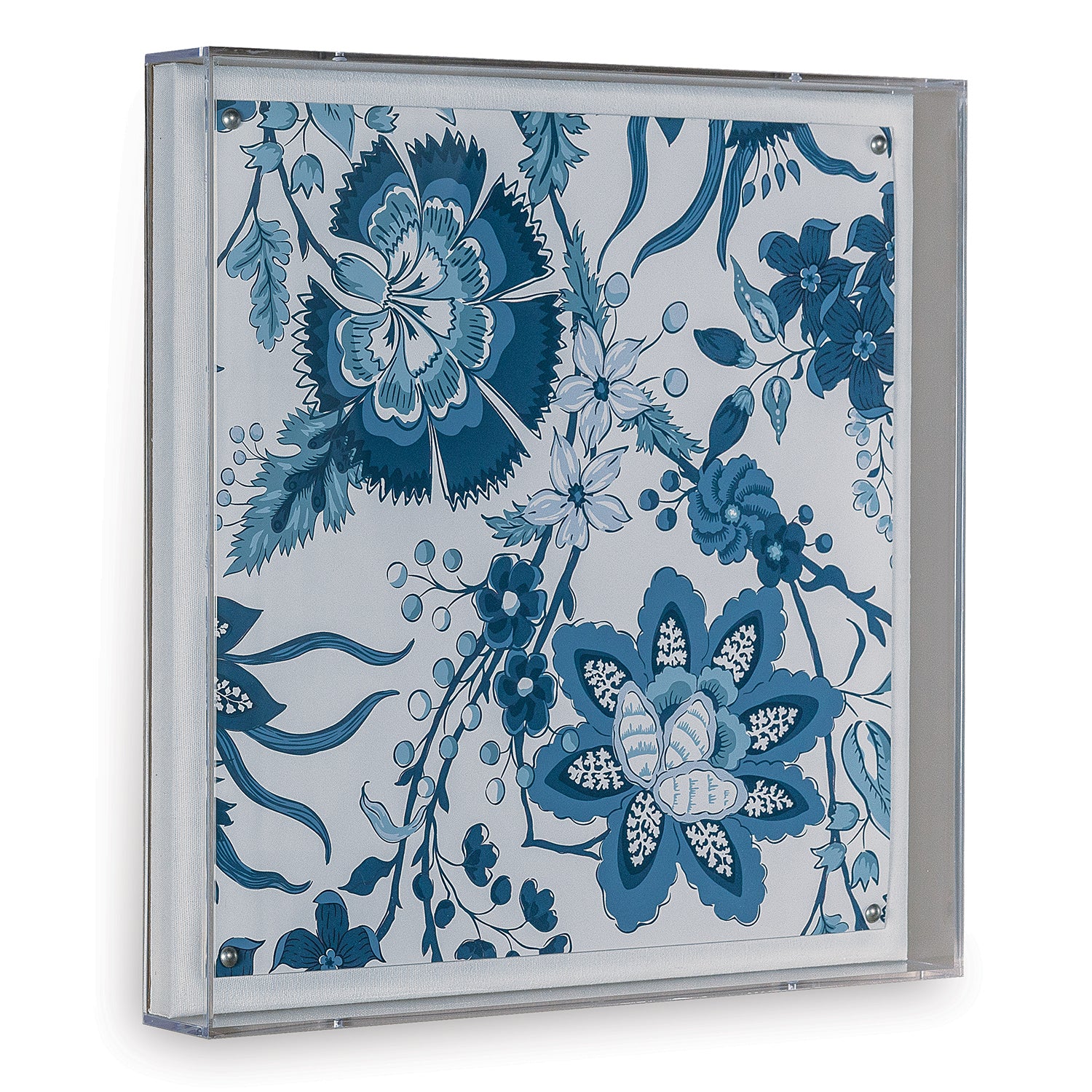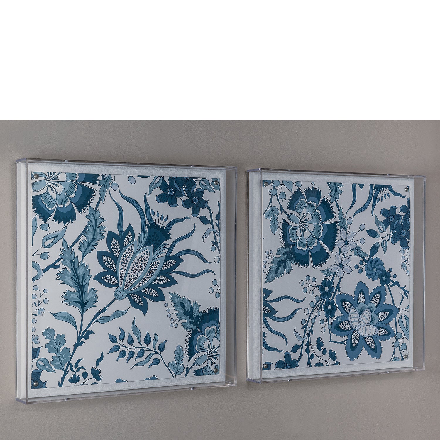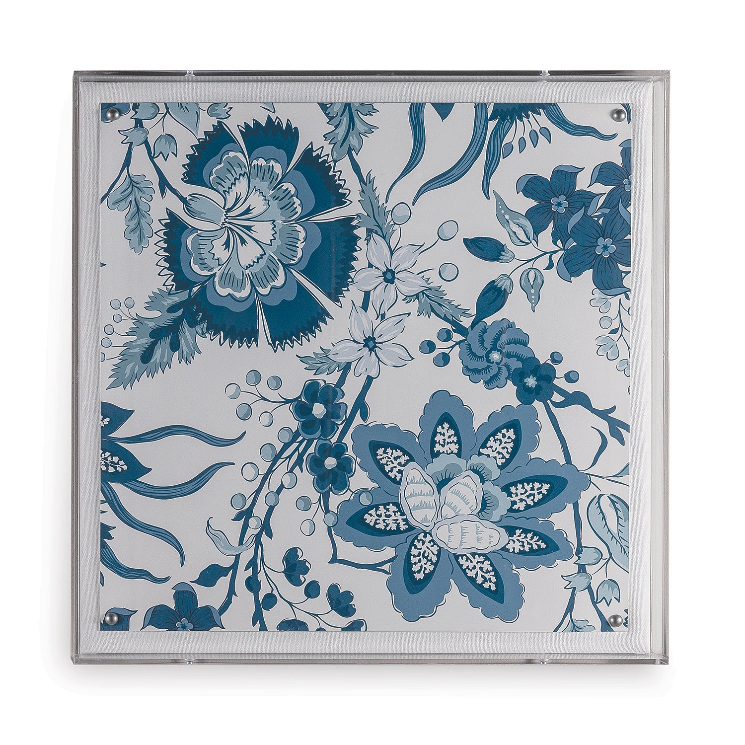 The artwork features a giclee print mounted under a 2.5" deep lucite shadow box. Attached to a linen wrapped interior panel, the artwork is finished with nickel nail head in each corner.