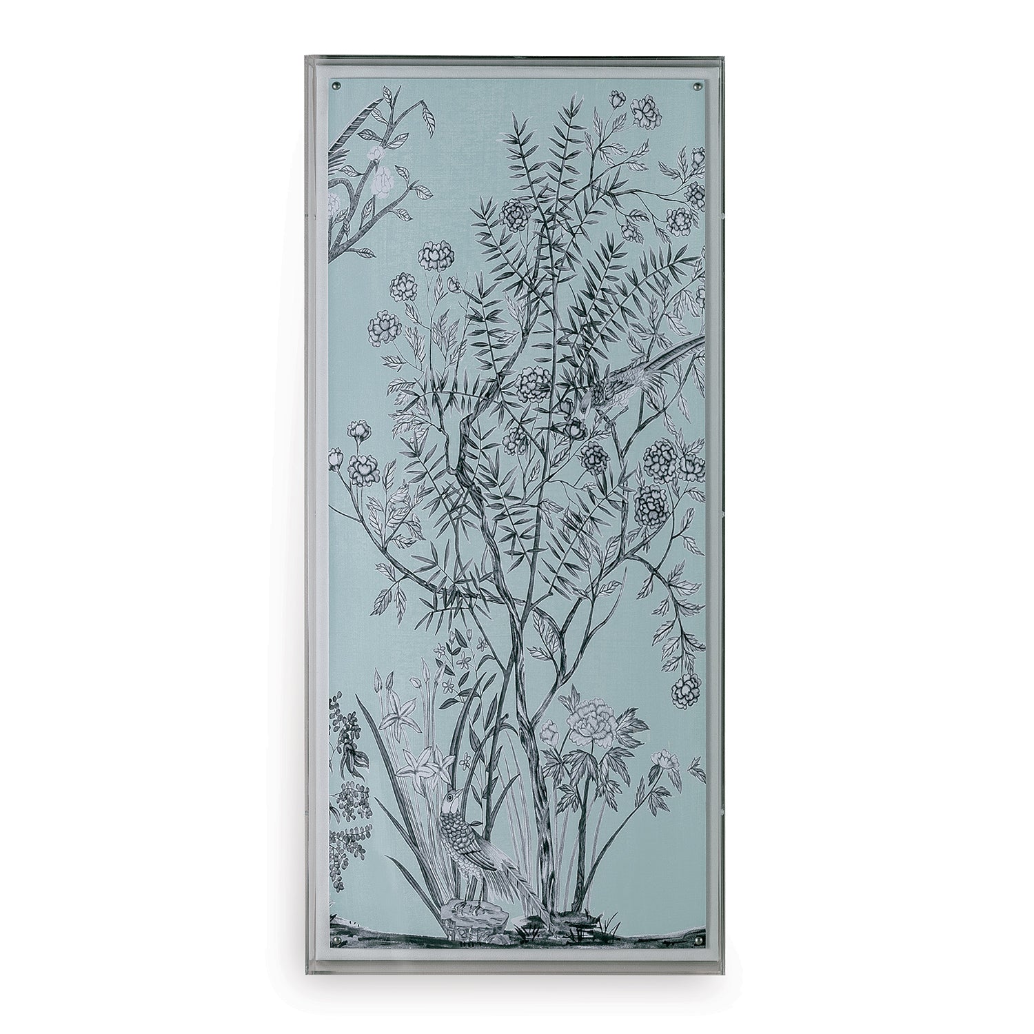 The Tree of Life is painted in the glorious chinoiserie style. The colors of celadon and subtle sepia tones in gray depict a scenic tableau of floral vines and plants in the countryside with birds chirping among the trees.