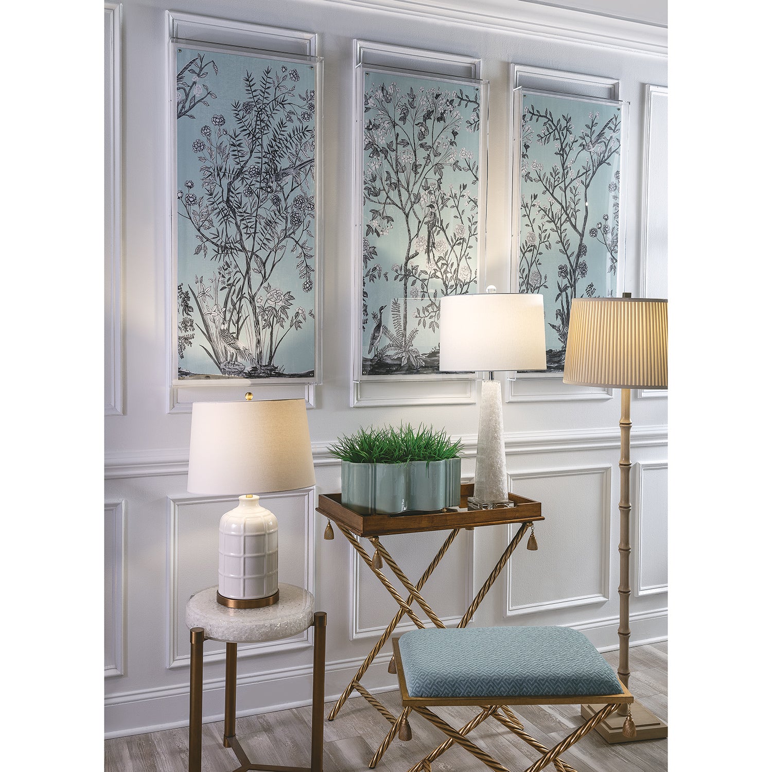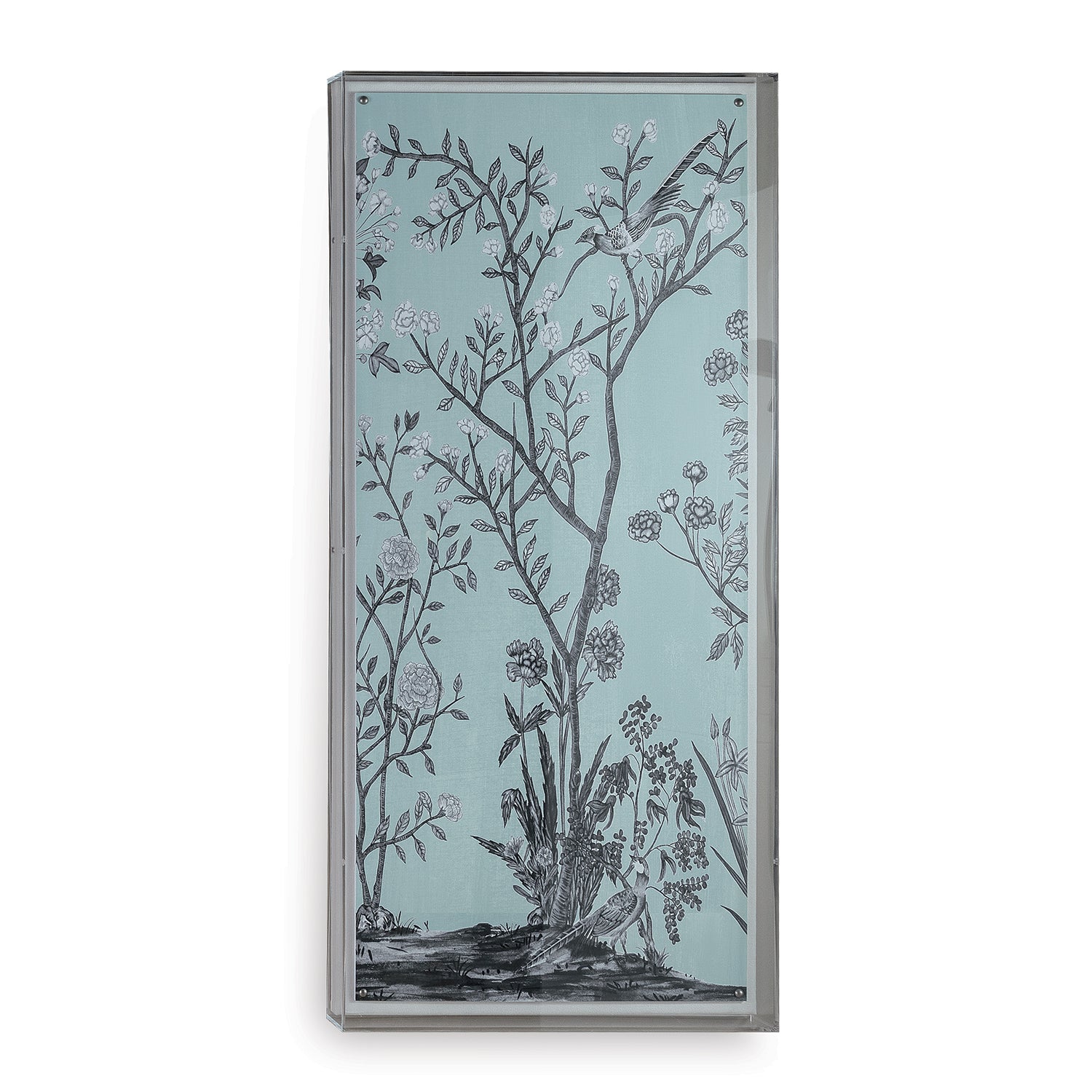 The Tree of Life is painted in the glorious chinoiserie style. The colors of celadon and subtle sepia tones in gray depict a scenic tableau of floral vines and plants in the countryside with birds chirping among the trees.