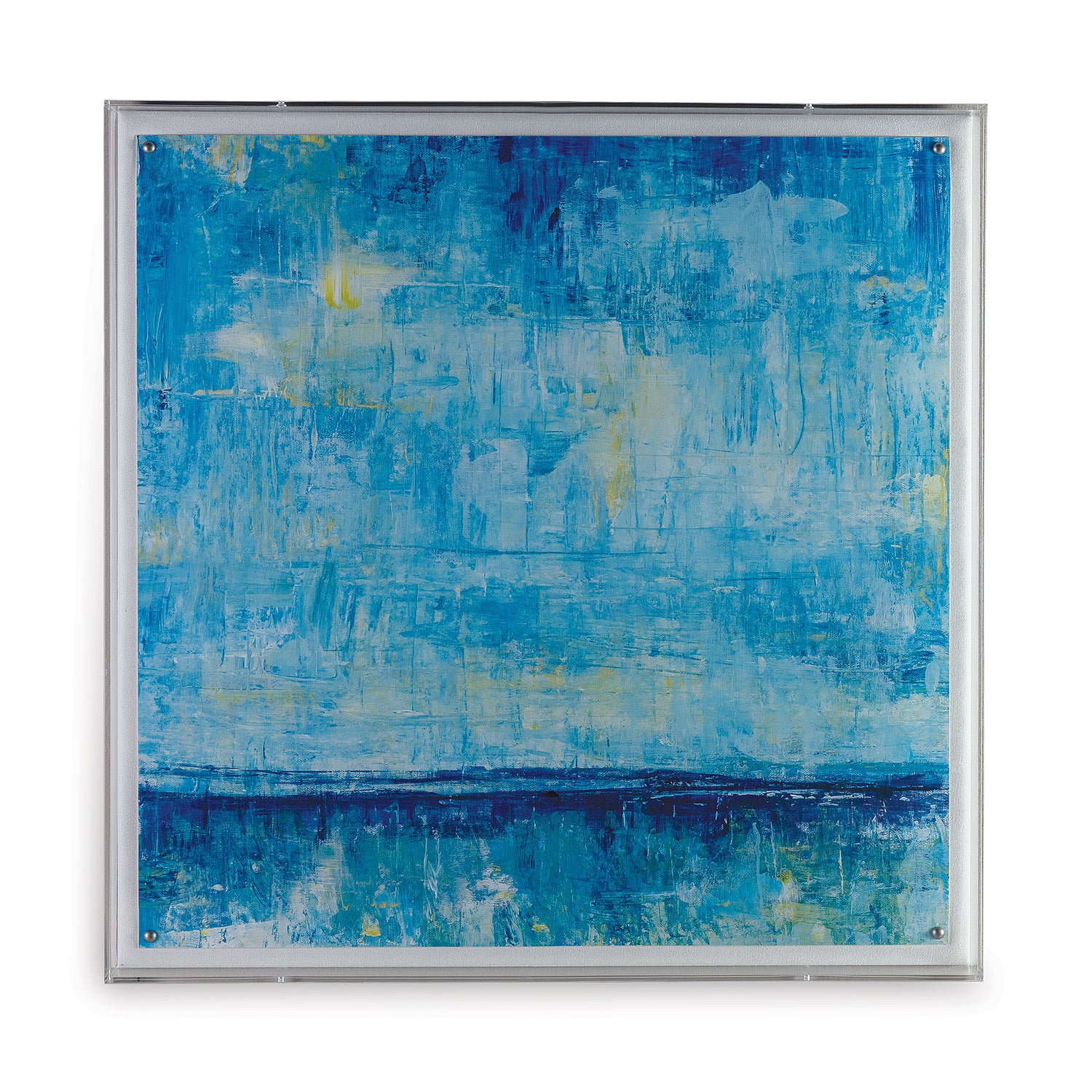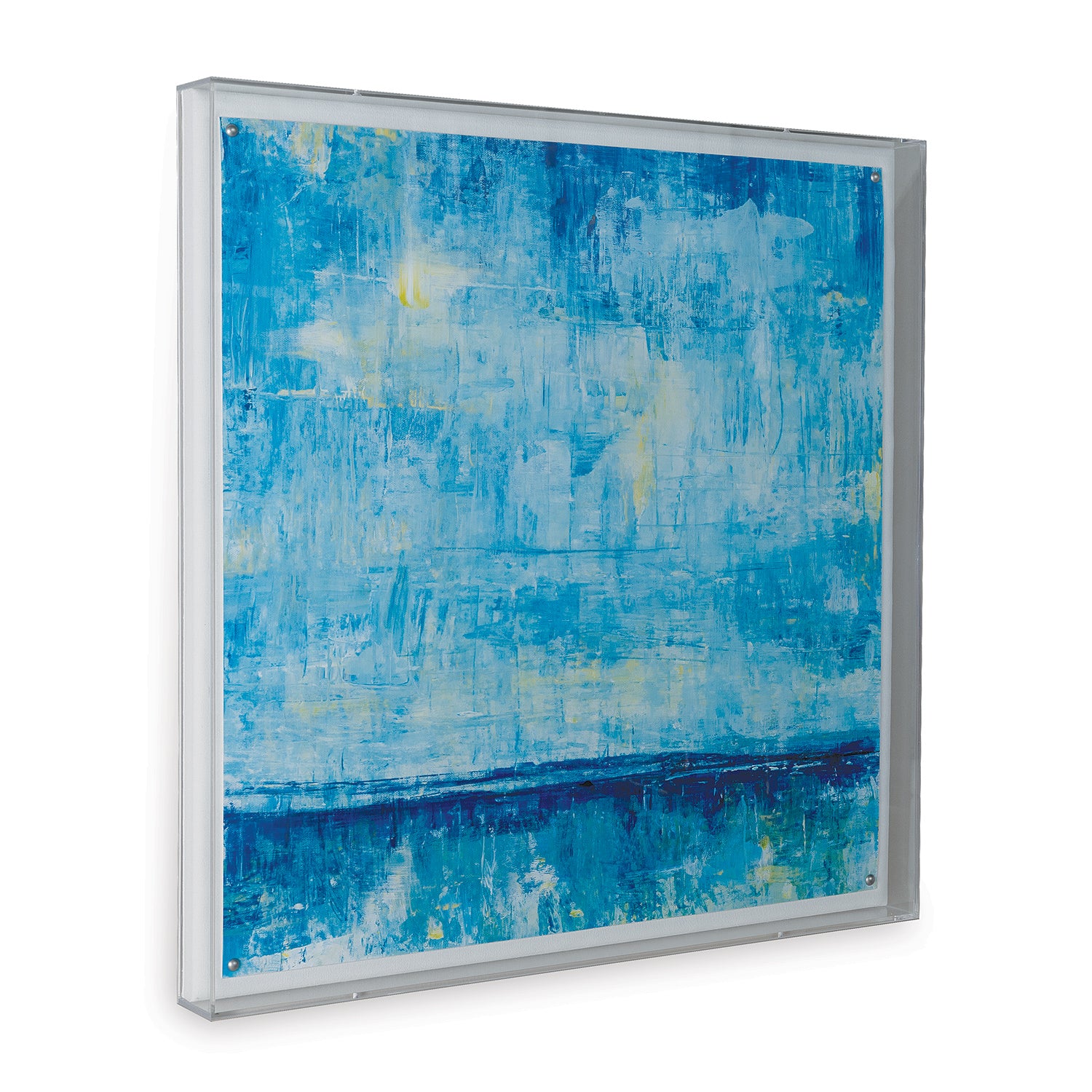 Our artwork collection features a giclee print mounted under a 2.5" deep lucite shadow box. Attached to a linen wrapped interior panel, the artwork is finished with a nail head in each corner.