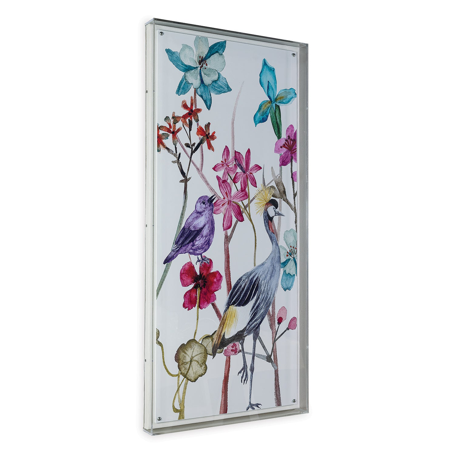 The image is a giclee. The art is mounted under a acrylic shadowbox frame and attached to an upholstered interior board covered in a cotton/linen fabric.