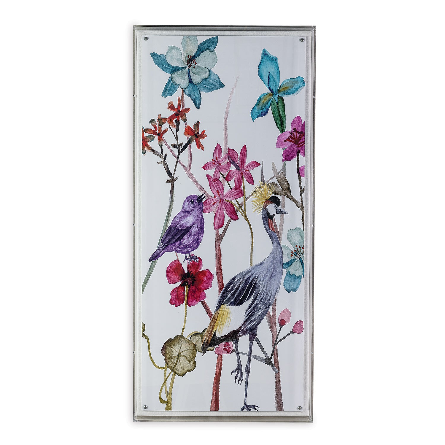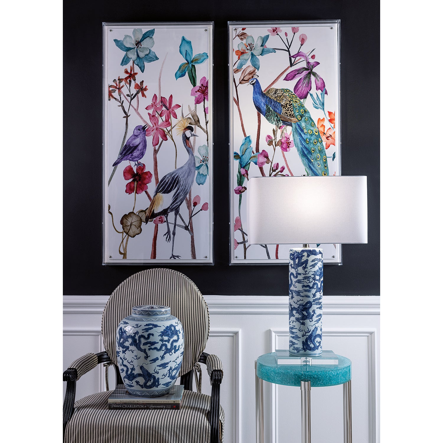 We love the bright colored florals with our peacocks and birds celebrating color in our artwork named "Peacock Garden". It is a colorful and expressive pair of panels embracing the watercolor look with our panels.