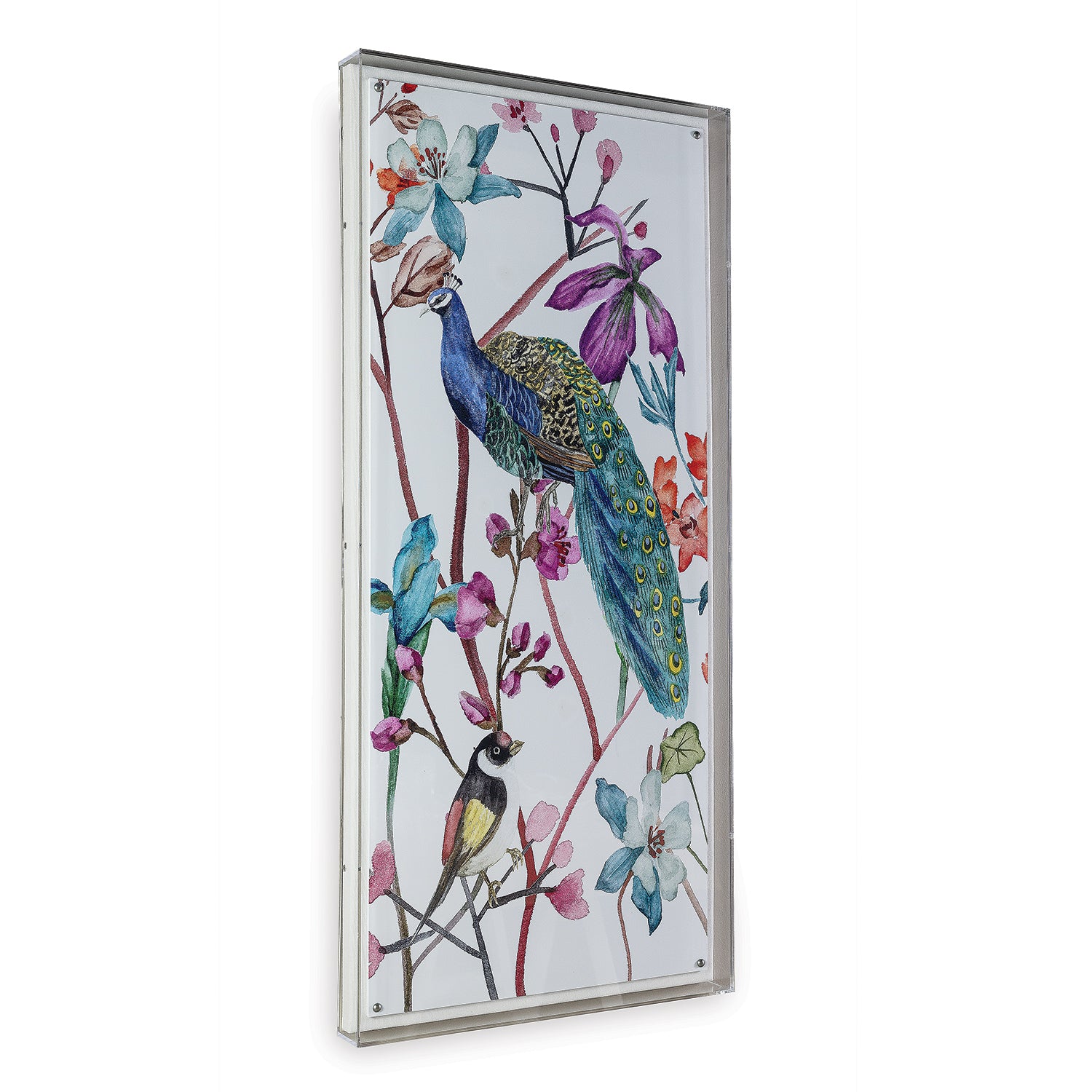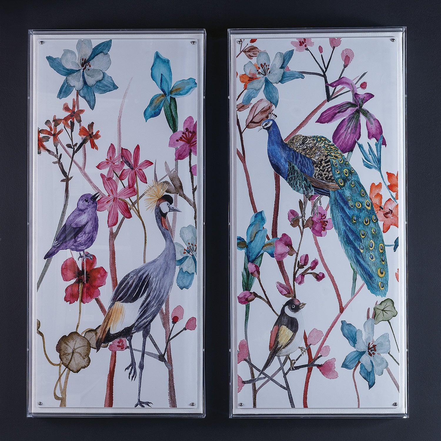 We love the bright colored florals with our peacocks and birds celebrating color in our artwork named "Peacock Garden". It is a colorful and expressive pair of panels embracing the watercolor look with our panels.