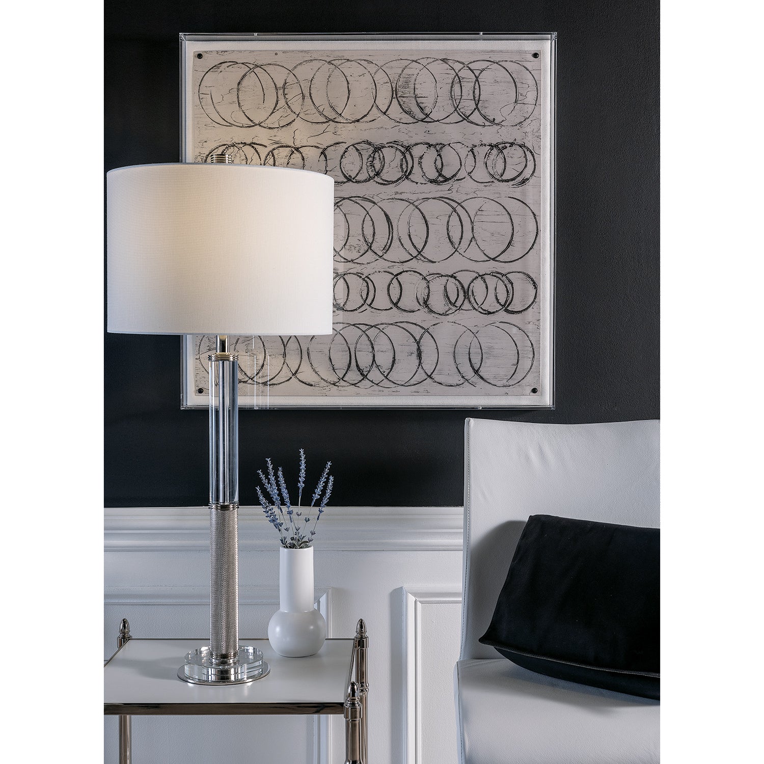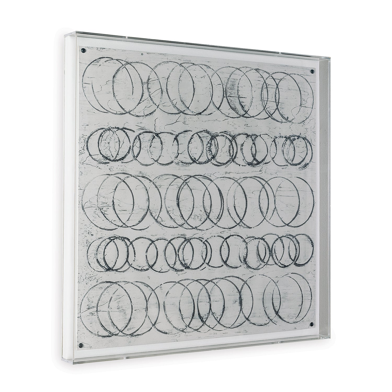 Circles is a modern geometric monochromatic giclee print that is mounted under a 2.5" deep framed clear acrylic shadow box. Attached to a linen wrapped interior panel, the artwork is finished with nickel nail head in each corner.