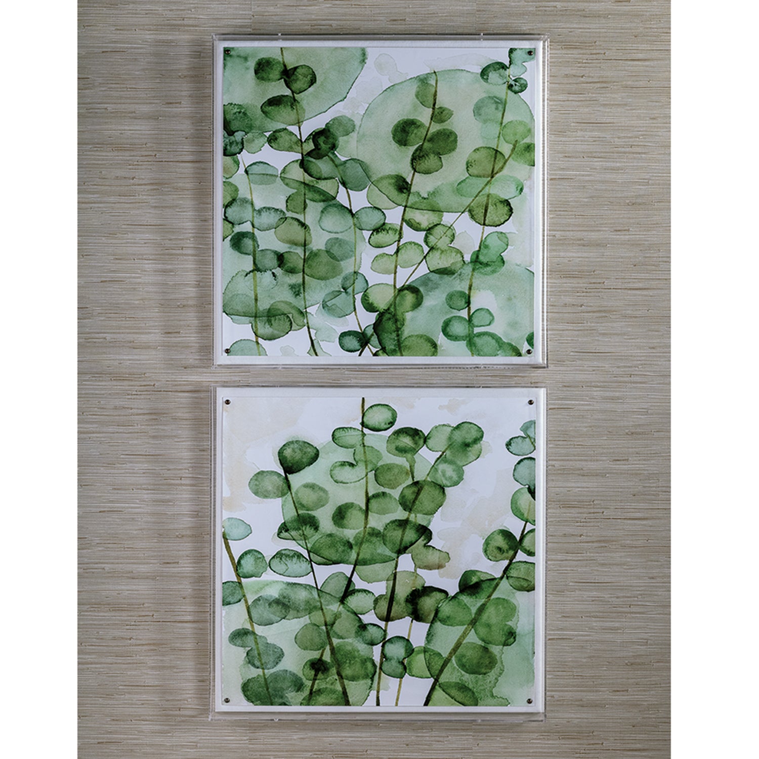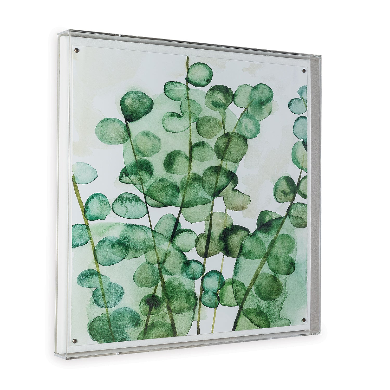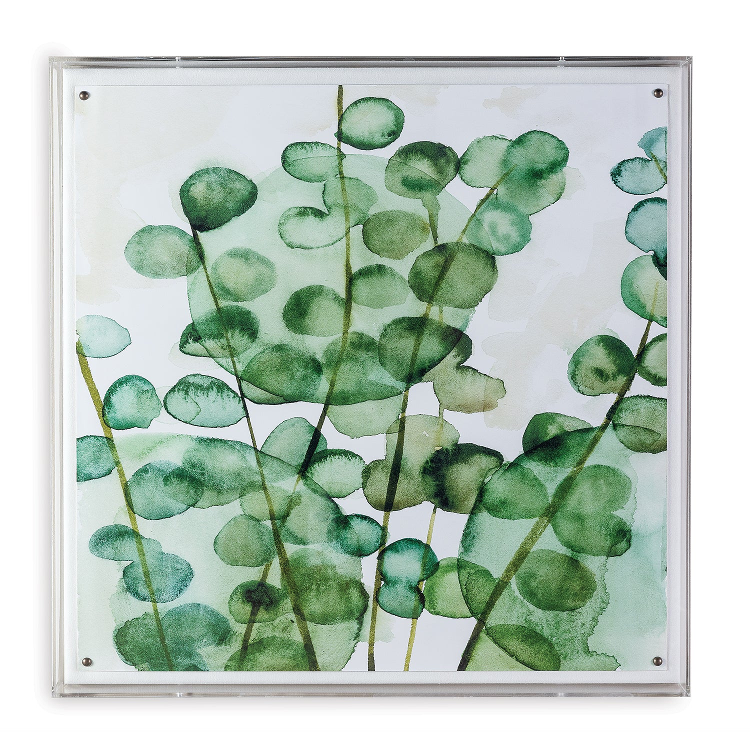 Zanzibar is a modern watercolor giclee print that is mounted under a 2.5" deep framed clear acrylic shadow box. Attached to a linen wrapped interior panel, the artwork is finished with nickel nail head in each corner.