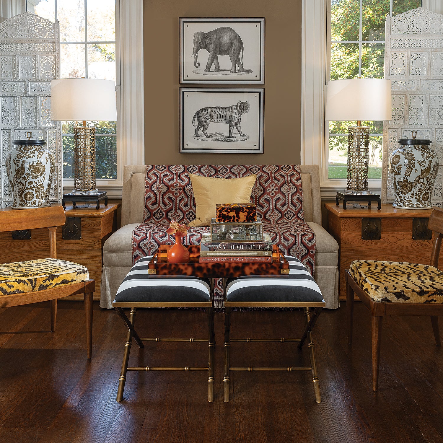 The African Safari artwork series includes a tiger, elephant, camel and lion. The artwork features black and white giclee prints mounted under a 2.5" deep tortoise framed acrylic shadow box. Attached to a linen wrapped interior panel, the artwork is finished with brass nail head in each corner.