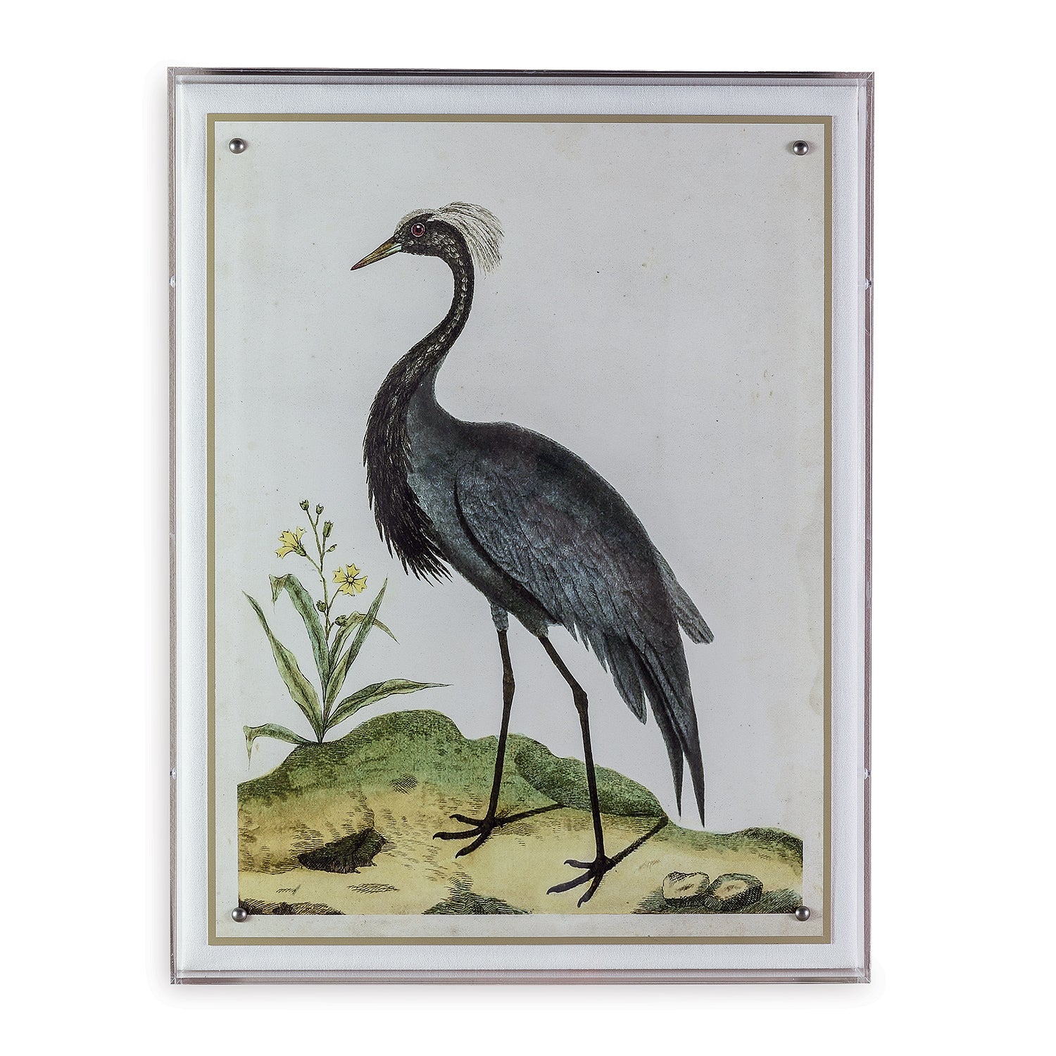 The Heron artwork series features a giclee print mounted under a 2.5" deep lucite shadow box. Attached to a linen wrapped interior panel, the artwork is finished with nickel nail head in each corner.