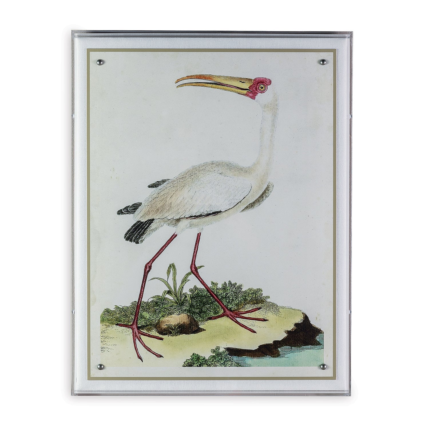 The Heron artwork series features a giclee print mounted under a 2.5" deep lucite shadow box. Attached to a linen wrapped interior panel, the artwork is finished with nickel nail head in each corner.