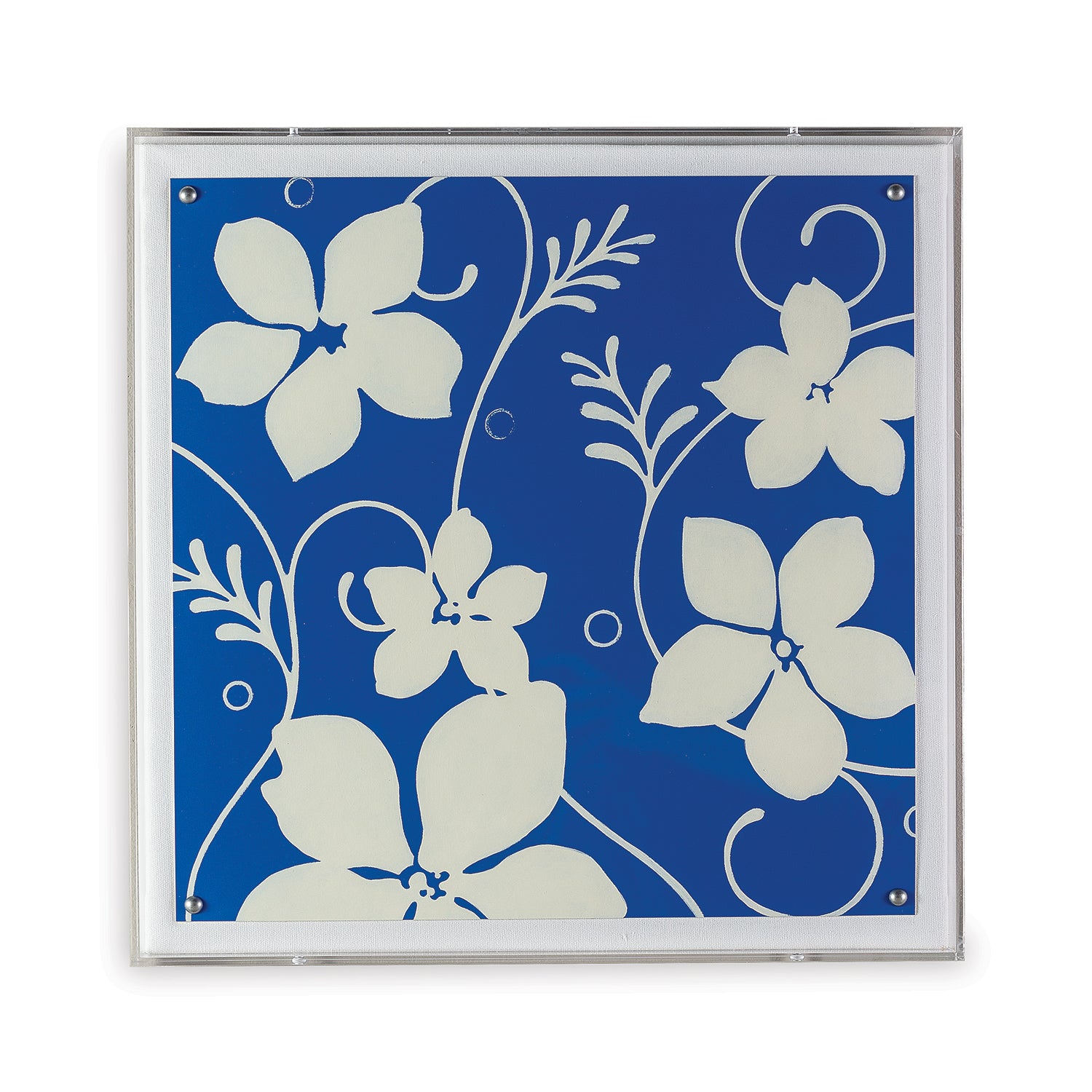 The artwork features a giclee print mounted under a 2.5" deep lucite shadow box. Attached to a linen wrapped interior panel, the artwork is finished with nickel nail head in each corner.