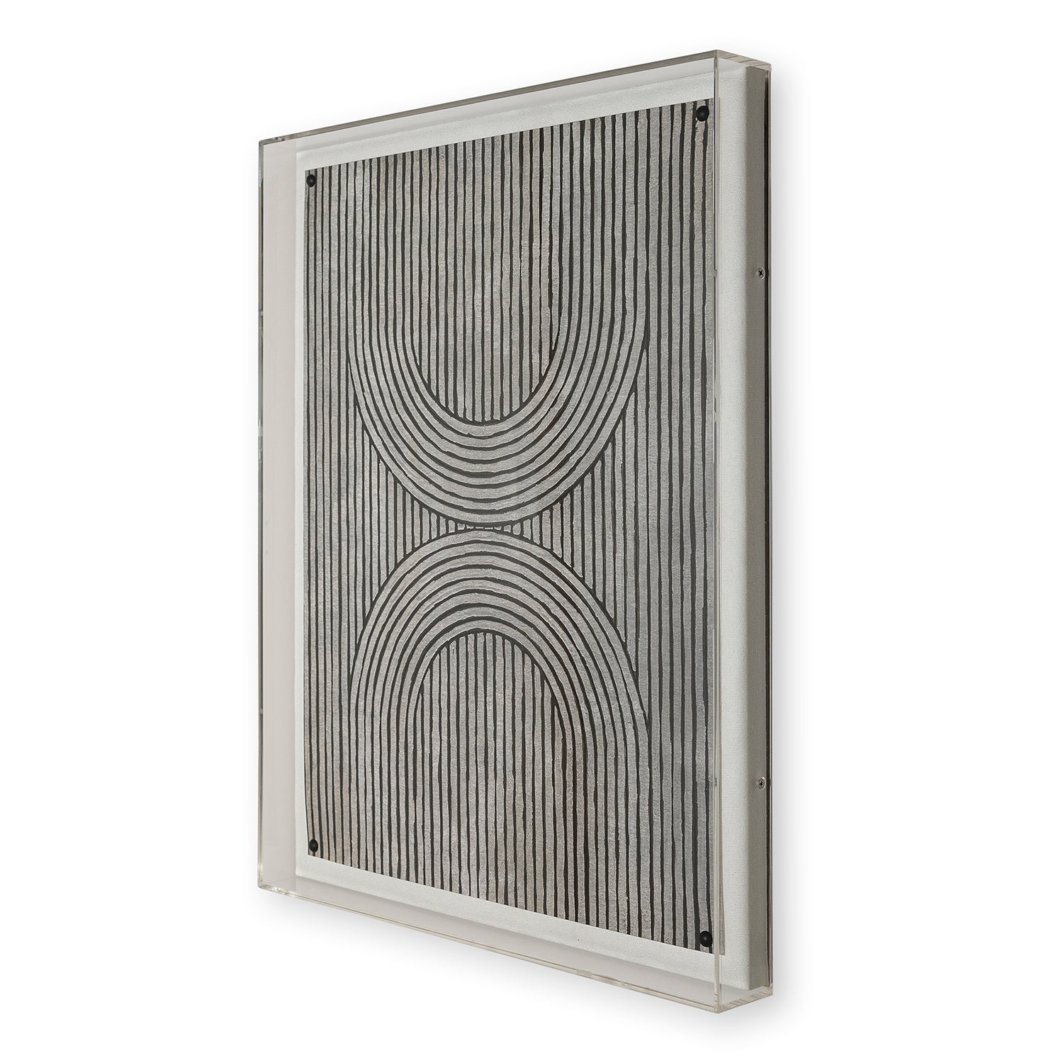 Featuring a giclee print mounted under a 2.5" deep lucite shadow box, the artwork print is attached to a linen wrapped interior panel and finished with black nail head in each corner.