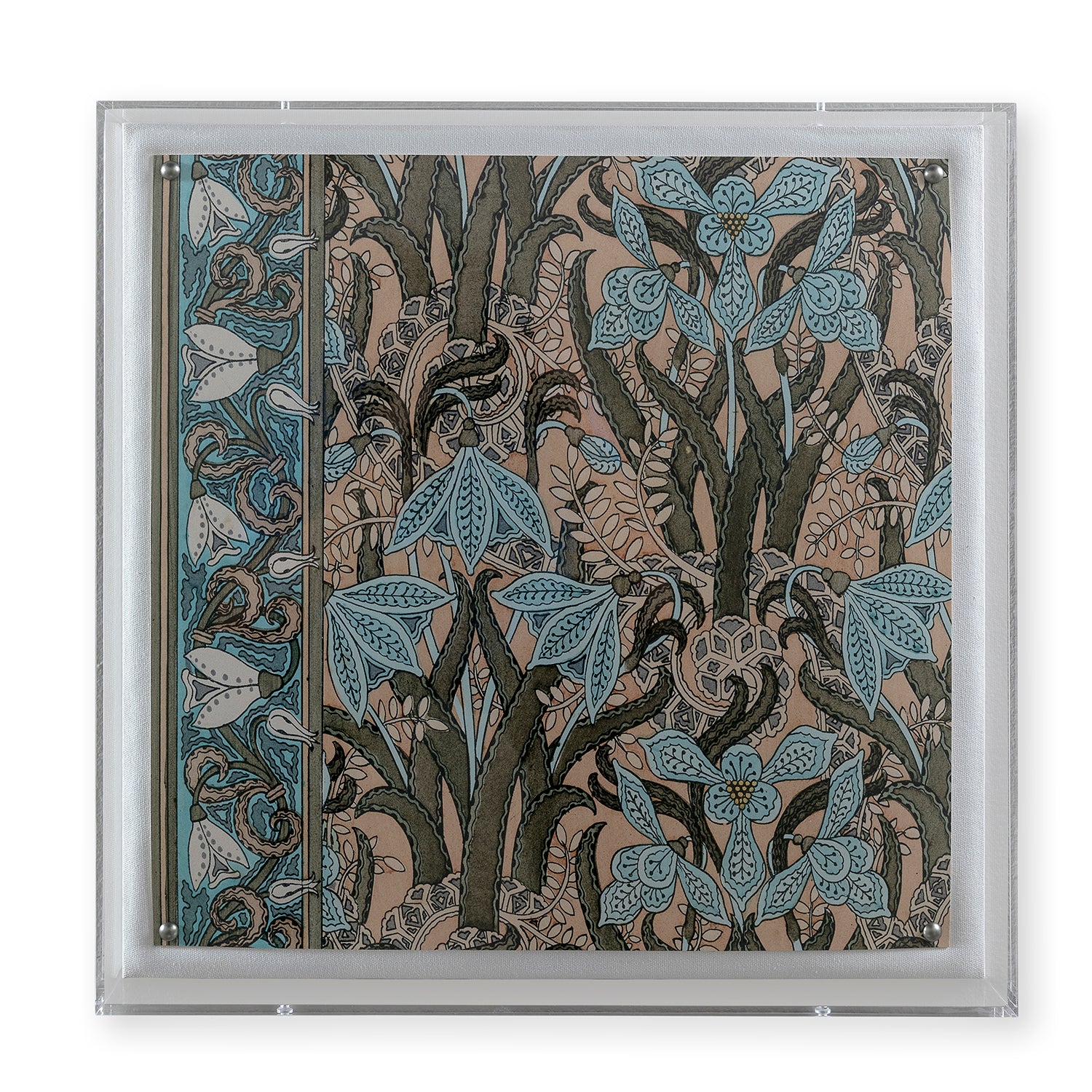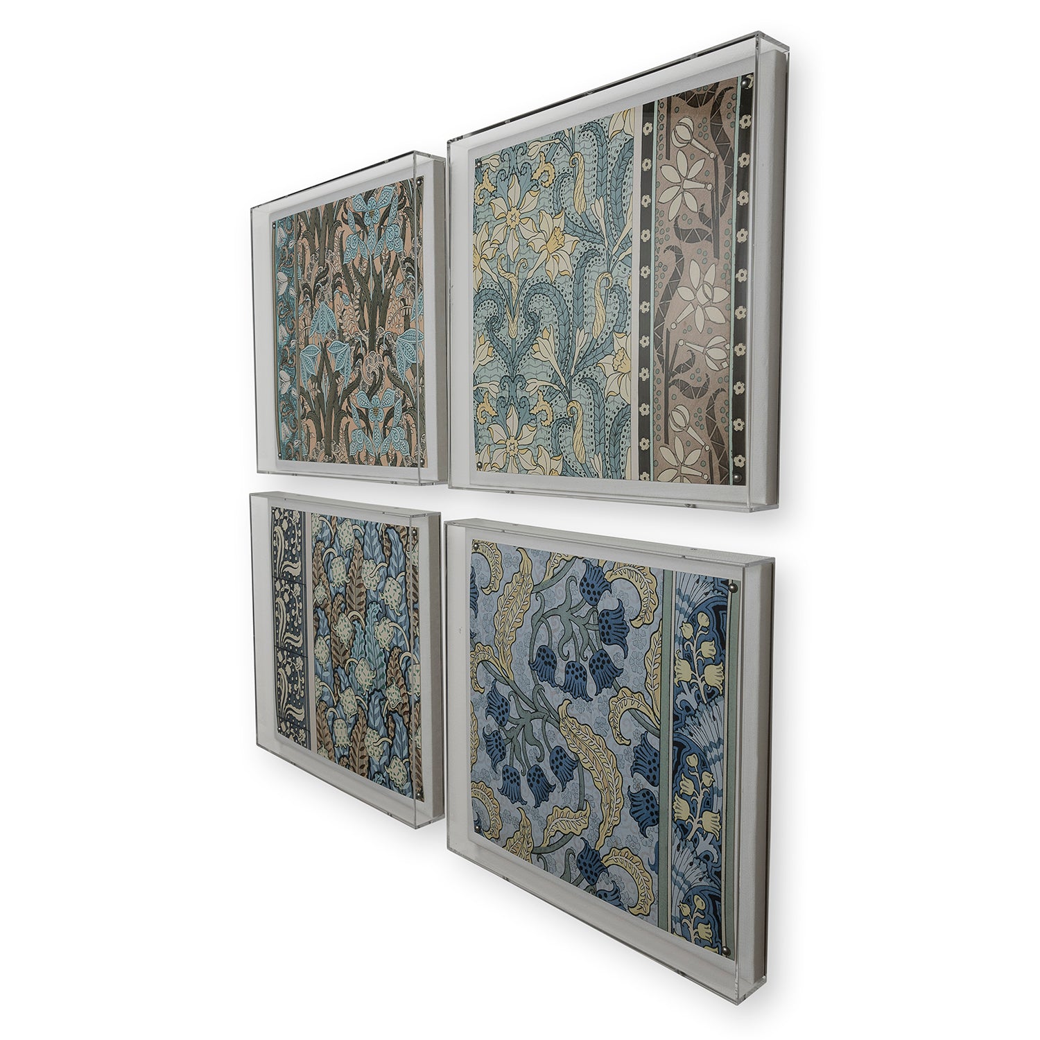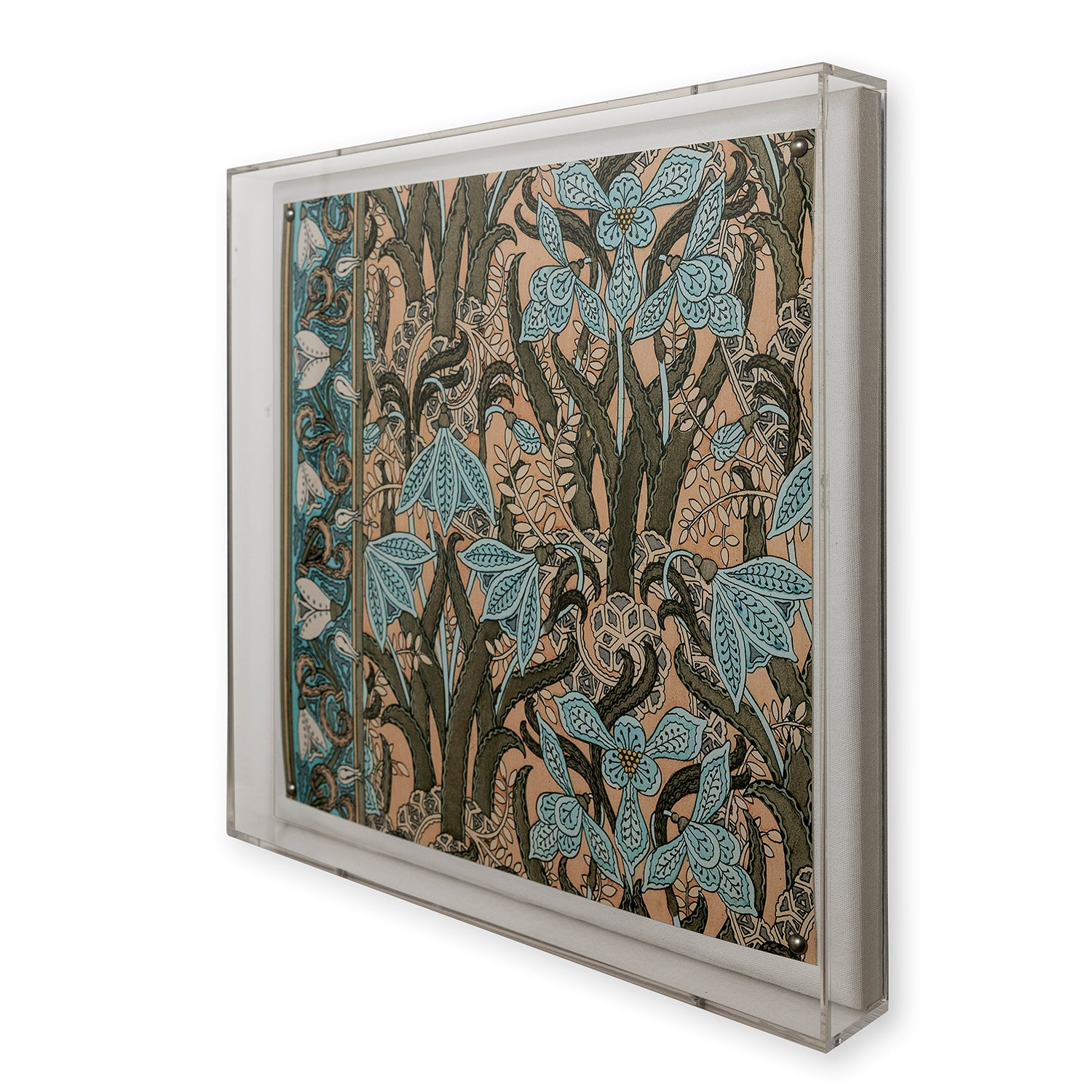 Featuring a giclee print mounted under a 2.5" deep clear lucite shadow box, the Nouveau print is attached to a linen wrapped interior panel and finished with black nail head in each corner.