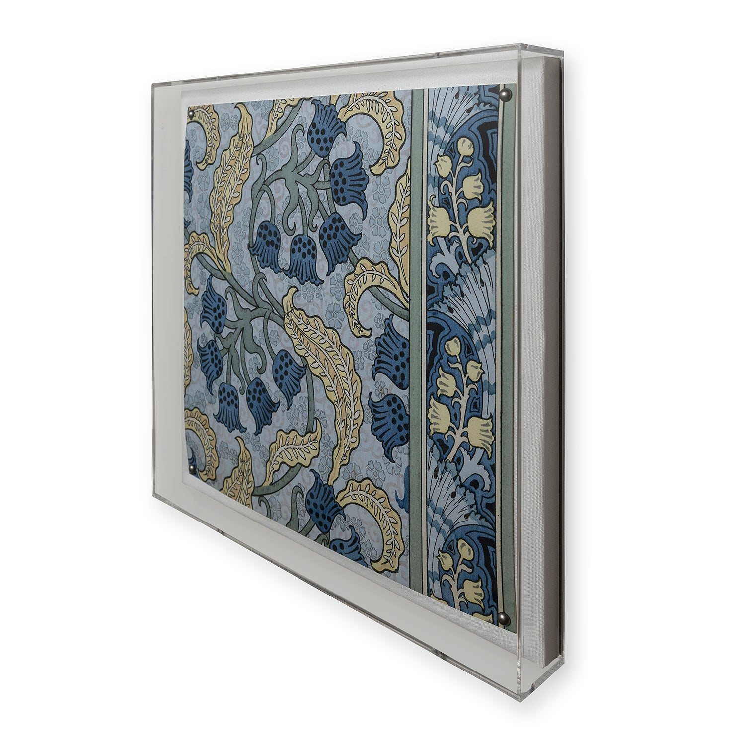 Featuring a giclee print mounted under a 2.5" deep clear lucite shadow box, the Nouveau print is attached to a linen wrapped interior panel and finished with black nail head in each corner.