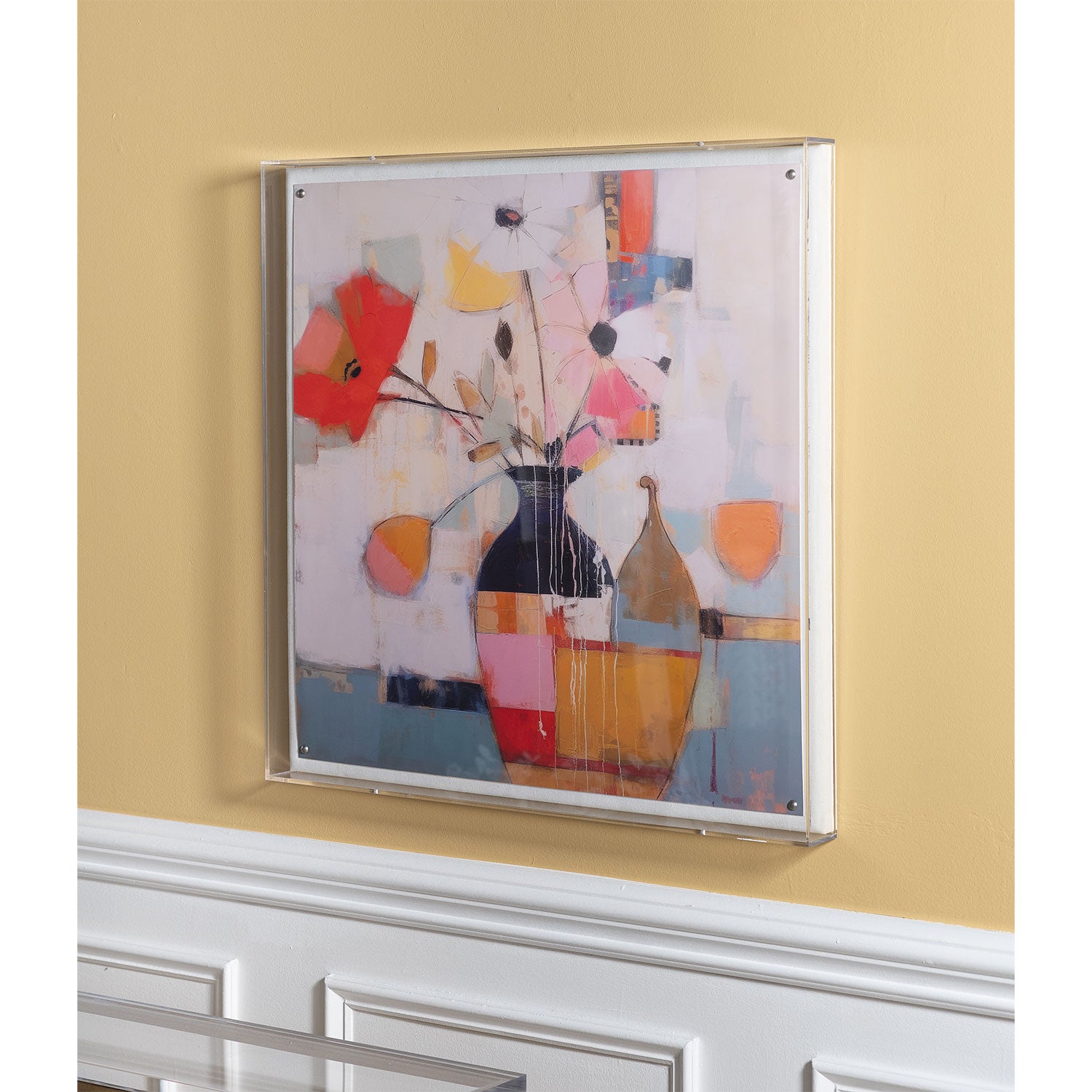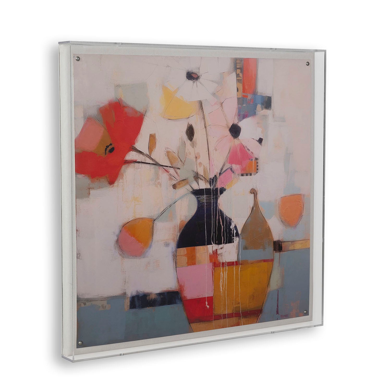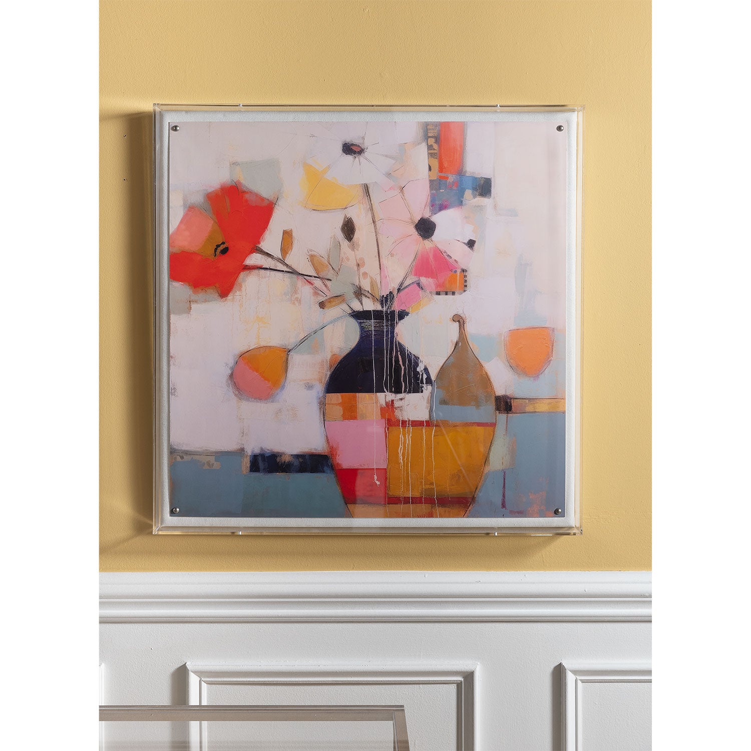 Our giclee print mounted under a 2.5" deep clear lucite shadow box, the floral print is attached to a linen wrapped interior panel and finished with silver nail head in each corner.