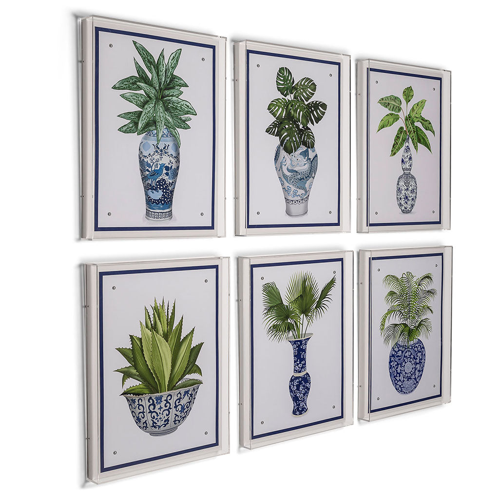 The blue & white porcelain series features a giclee print mounted under a 2.5" deep lucite shadow box. Attached to a linen wrapped interior panel, the artwork is finished with nickel nail head in each corner.
