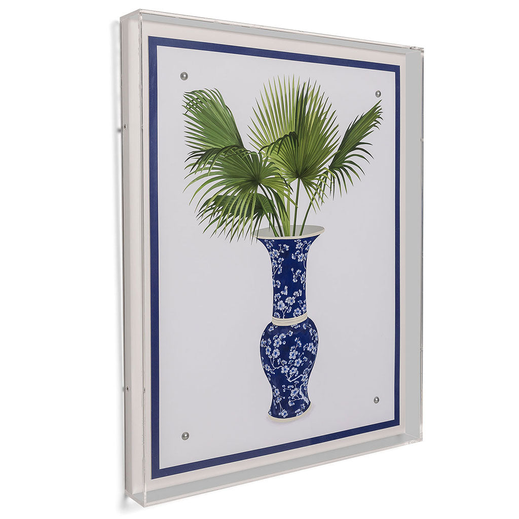 The blue & white porcelain series features a giclee print mounted under a 2.5" deep lucite shadow box. Attached to a linen wrapped interior panel, the artwork is finished with nickel nail head in each corner.