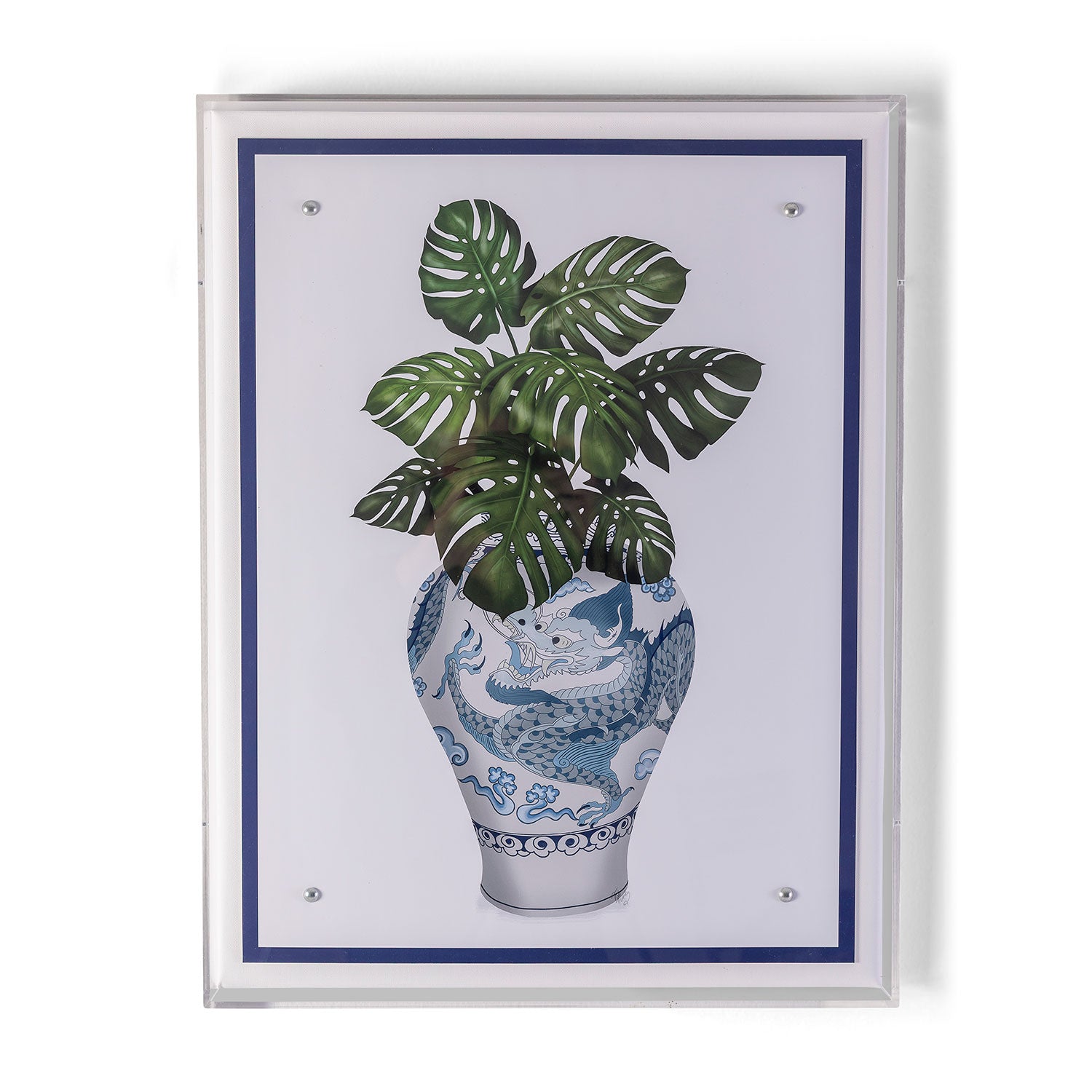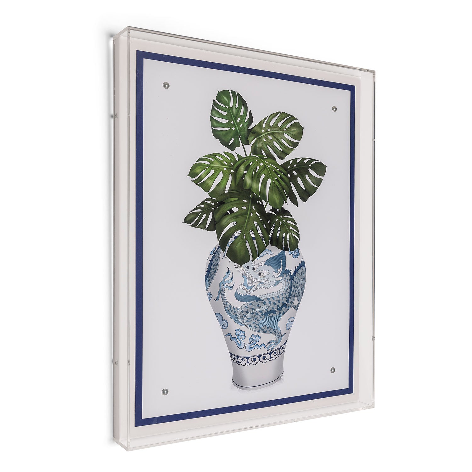 The blue & white porcelain series features a giclee print mounted under a 2.5" deep lucite shadow box. Attached to a linen wrapped interior panel, the artwork is finished with nickel nail head in each corner.