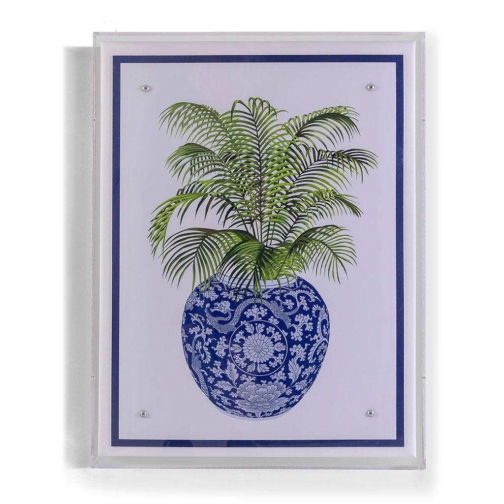 The blue & white porcelain series features a giclee print mounted under a 2.5" deep lucite shadow box. Attached to a linen wrapped interior panel, the artwork is finished with nickel nail head in each corner.